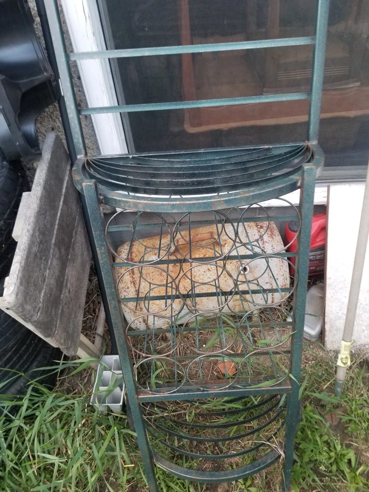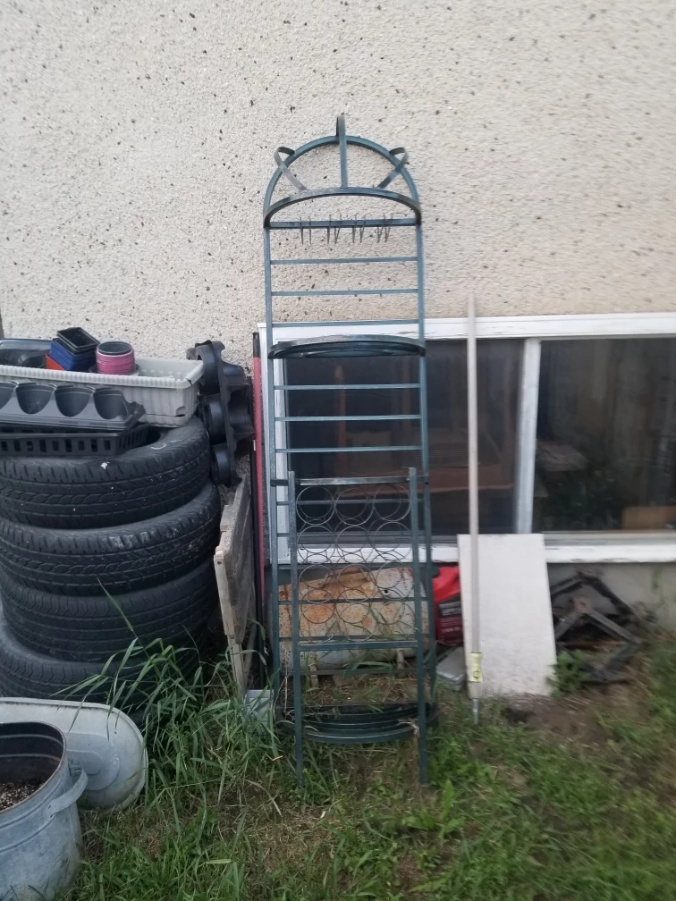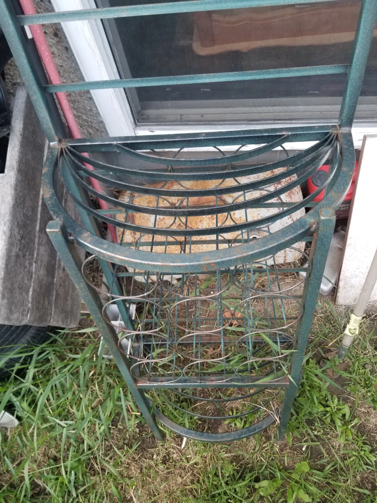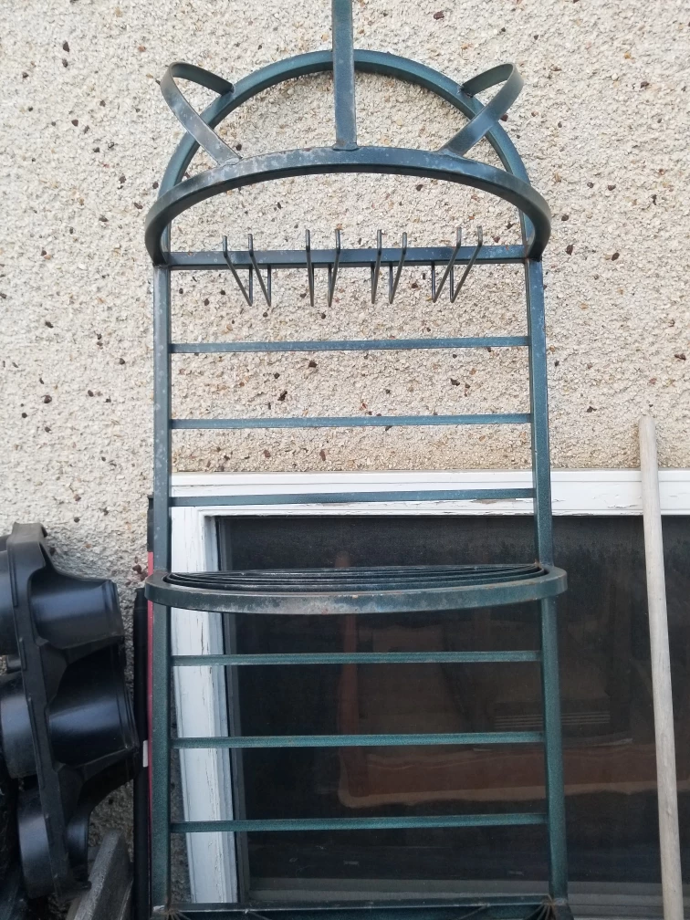 Selling a metal wine stand. It has a few shelves and a rack on top for hanging glasses . It is in used condition, with some signs of wear and rust, but is still sturdy and functional.