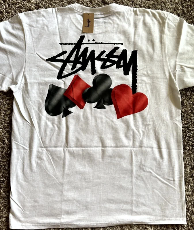 I'm selling a Stussy Poker Suits in white, size medium. It's still in the original packaging! The shirt features the Stussy logo and a cool design with playing card suits.
