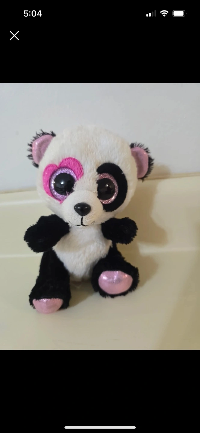 Here's a cute Ty Beanie Boo panda plush toy! It features a white and black design with sparkly pink accents on the eyes and feet. It's in great condition and ready for a new home!