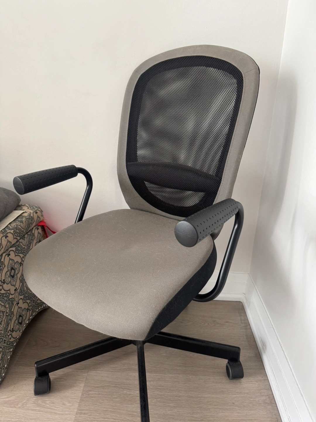 Selling a comfy grey office chair! It's in good condition and ready for a new home office setup. Perfect for working or studying at home. A little creaky with the arm rest but works fine. Moving out. Must go asap