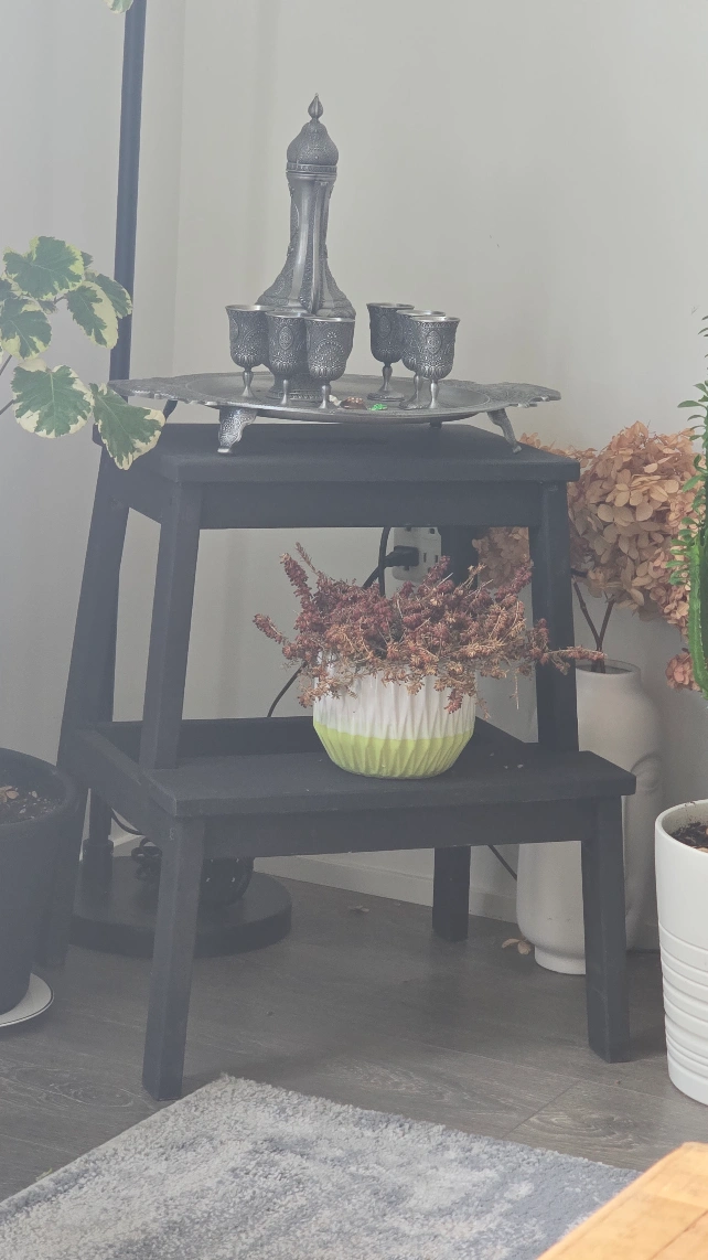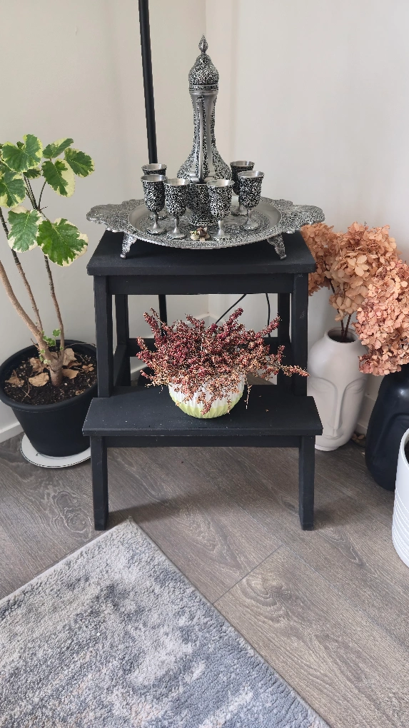 Selling a handy black wooden step stool. It's in great shape and perfect for reaching those higher shelves or adding a bit of height to your plants. It’s sturdy and ready for a new home!