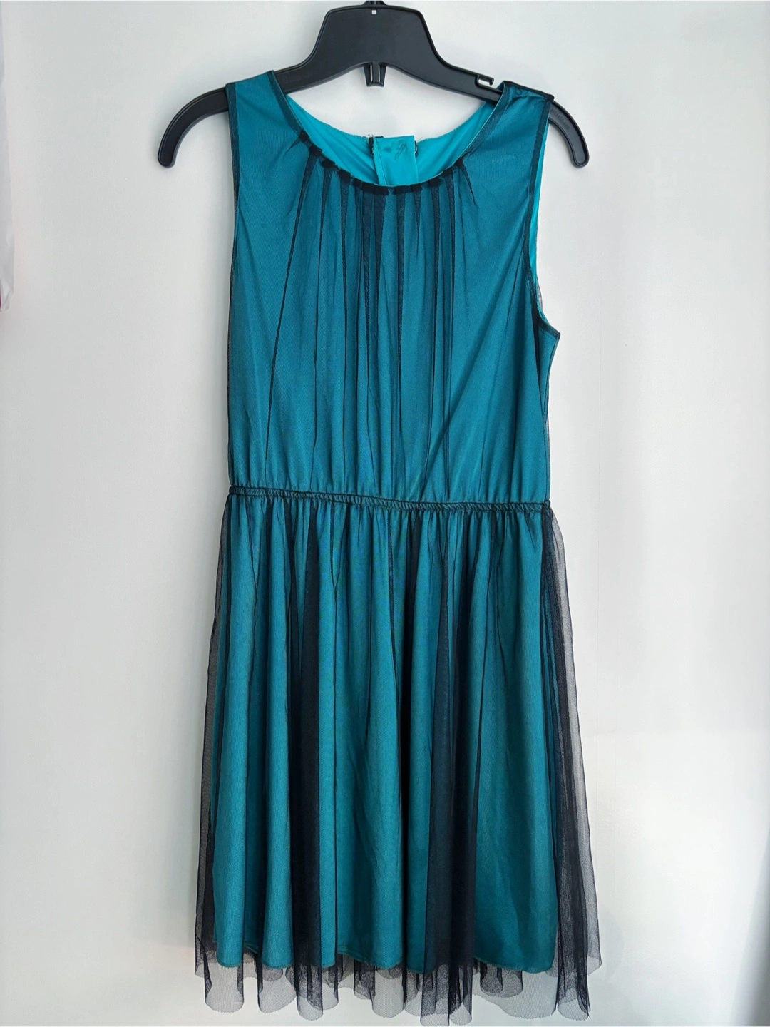 This teal and black dress is in great condition! It features a zipper in the back and a black tulle skirt. Perfect for a night out or a special occasion. The teal material is satin. Super silky. Size small.