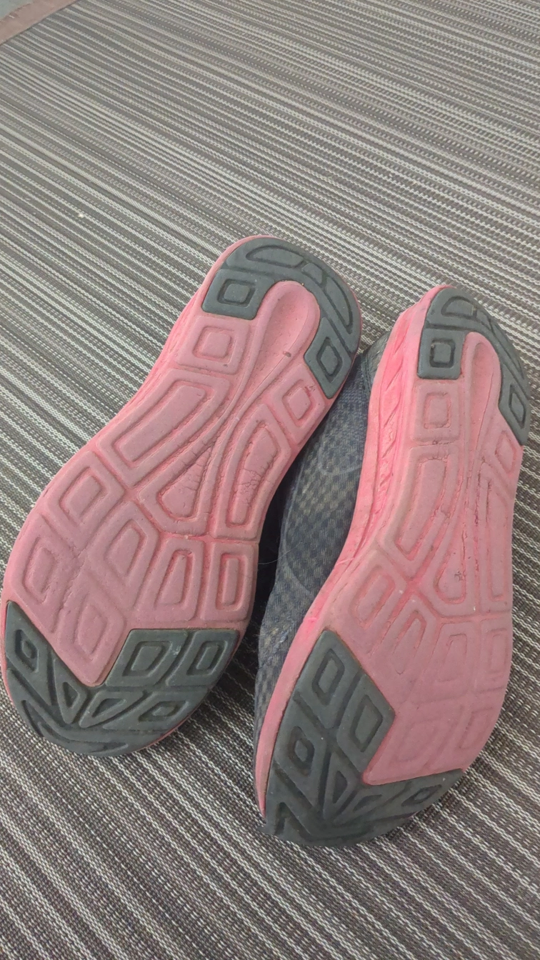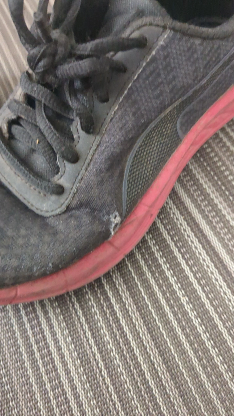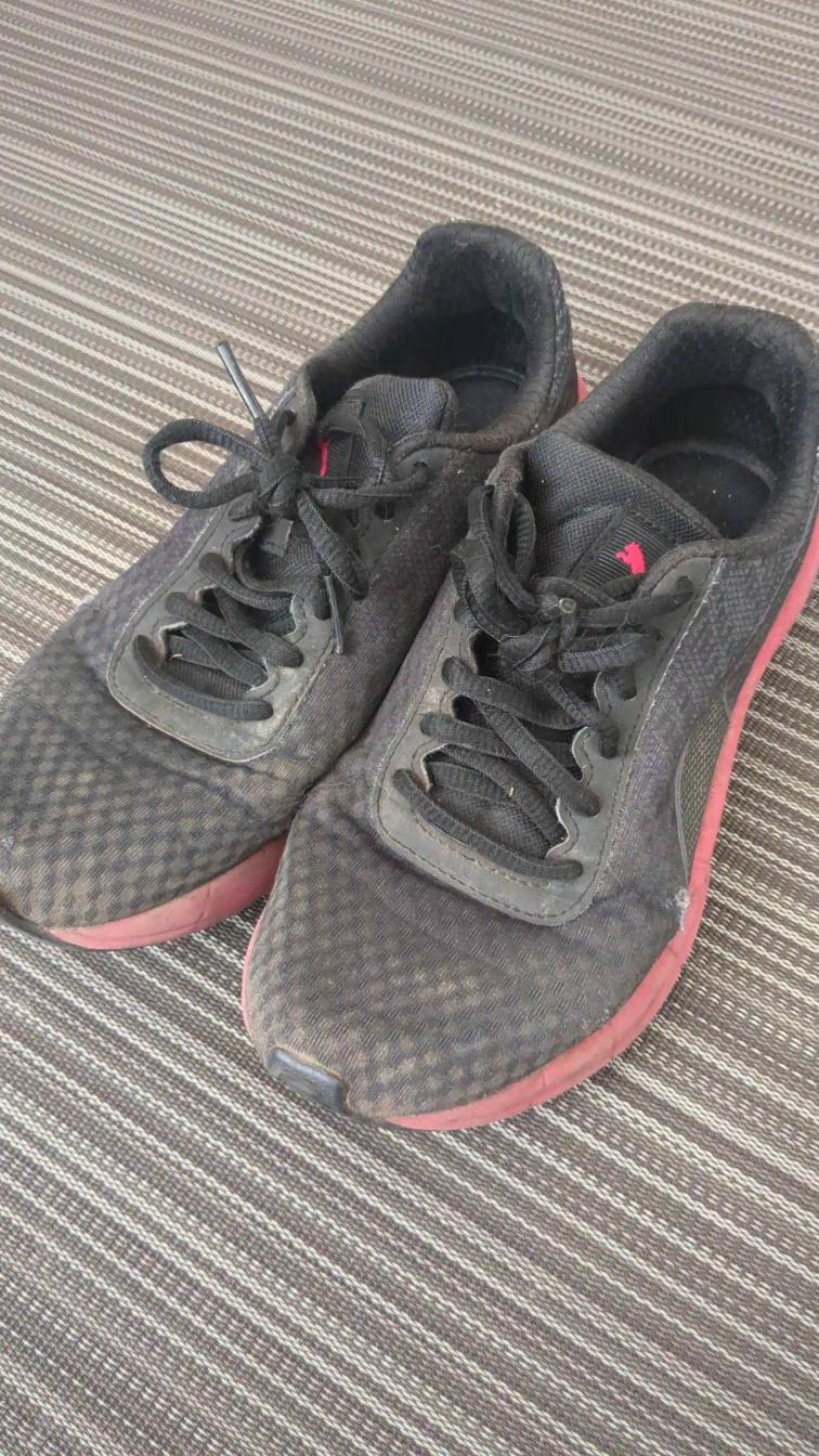 A free pair of Puma running shoes in black with pink accents. They show signs of wear, as seen in the photos, but still have lots of life left for casual jogs or workouts