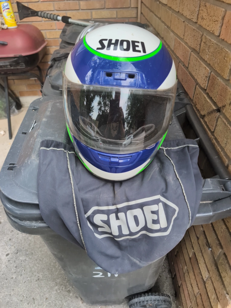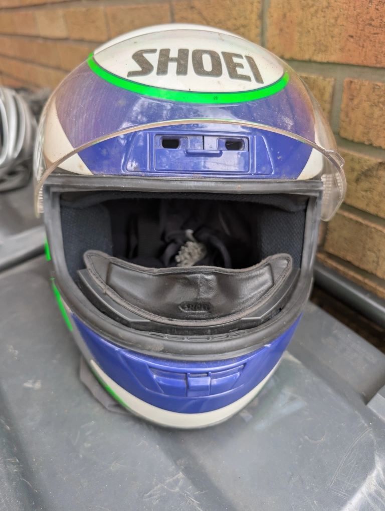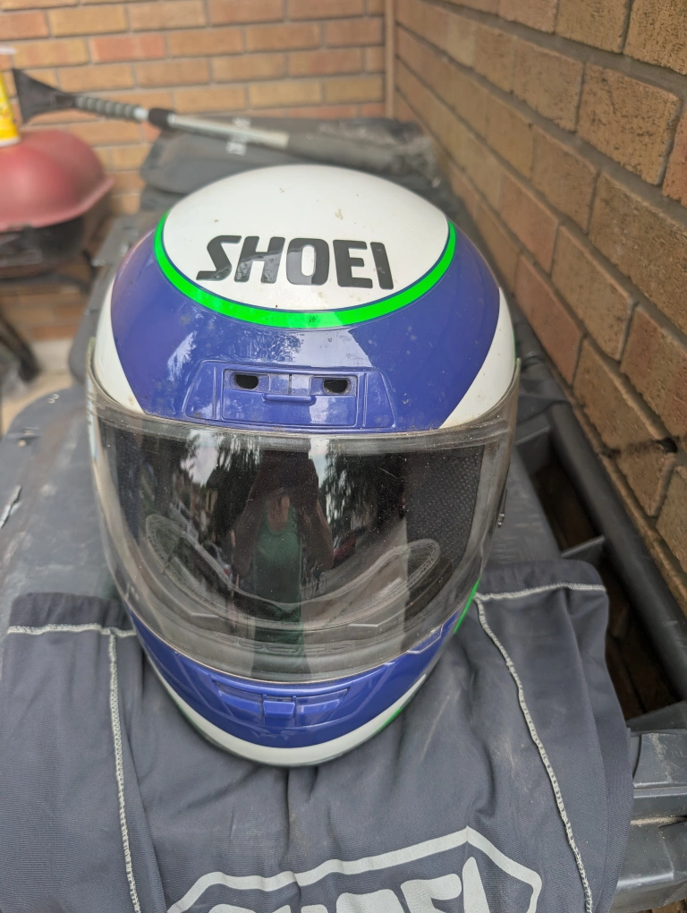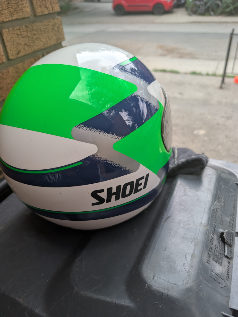 Selling a Shoei helmet in blue, white, and green. It shows some signs of use, but it's still in good condition for riding. Comes with a Shoei bag for storage