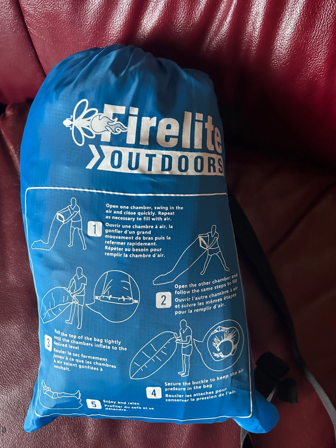 72Check out this Firelite Outdoors inflatable sleeping pad! It's perfect for camping and outdoor adventures. The instructions are printed right on the bag, so you'll always know how to inflate and pack it up. Enjoy a comfy night's sleep under the stars!