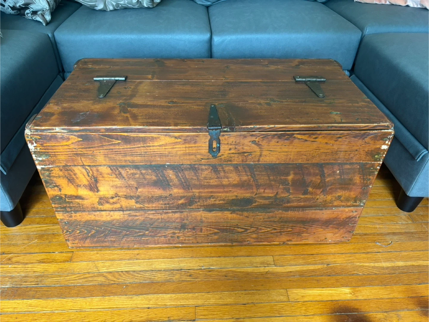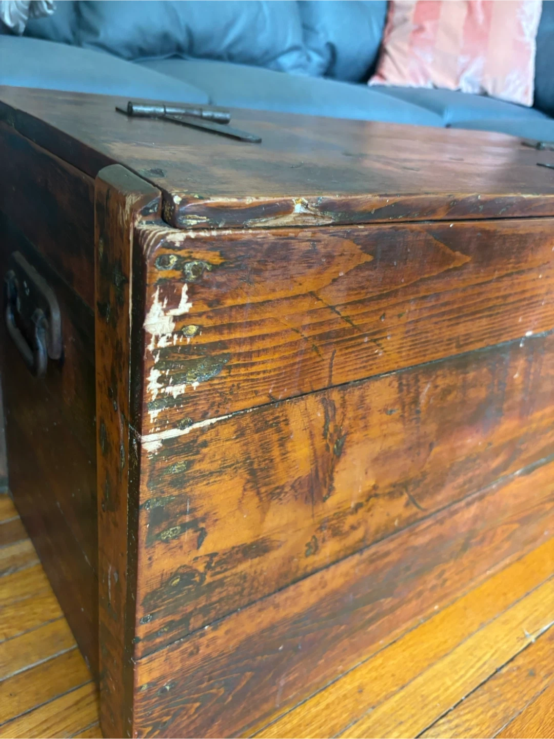 Selling a rustic wooden storage trunk. It has a nice, aged look with some wear and tear that adds to its character. Perfect for storing blankets, toys, or other items. It has a hinged top and metal hardware.