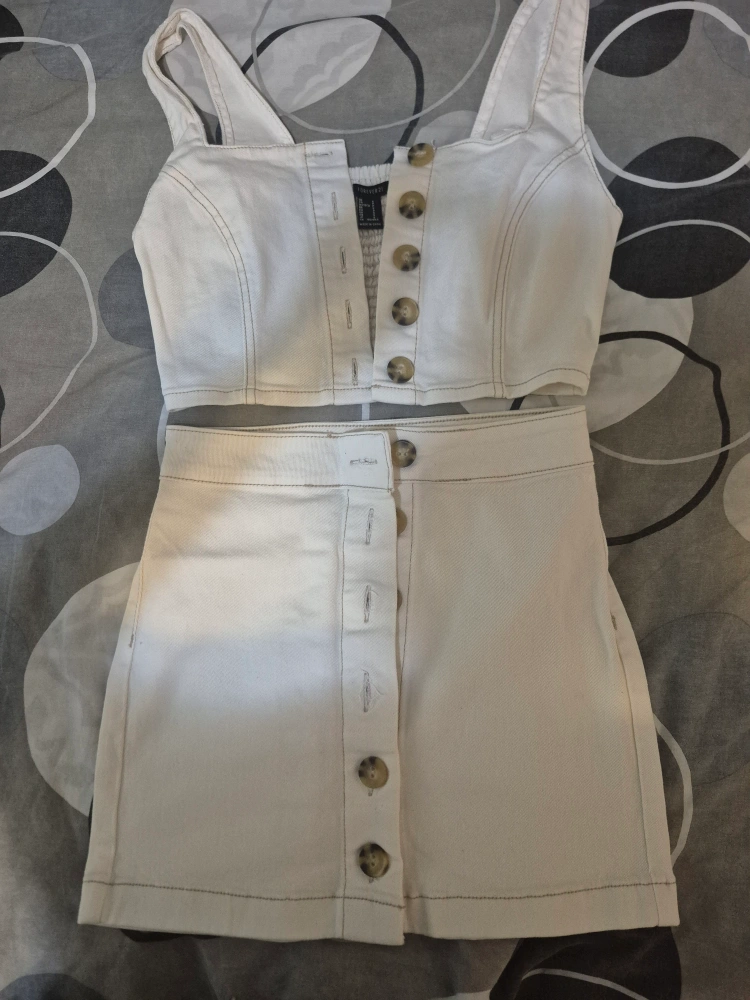 I'm selling a cute Forever 21 two-piece set. It's a white top and skirt combo, perfect for summer! The set is a size small.