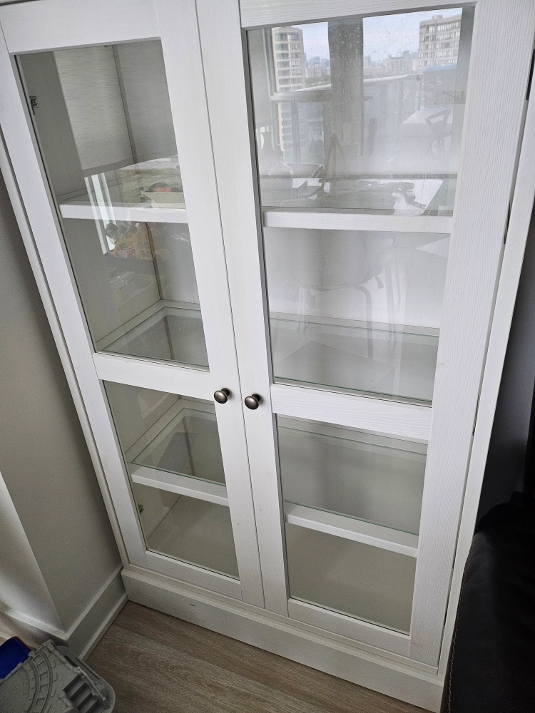 Selling a white IKEA HAVSTA glass-door cabinet. It's in good condition, perfect for displaying your favourite items. There is a small chip on the bottom and top. Originally bought for $420. Dimensions are 81x35x123 cm