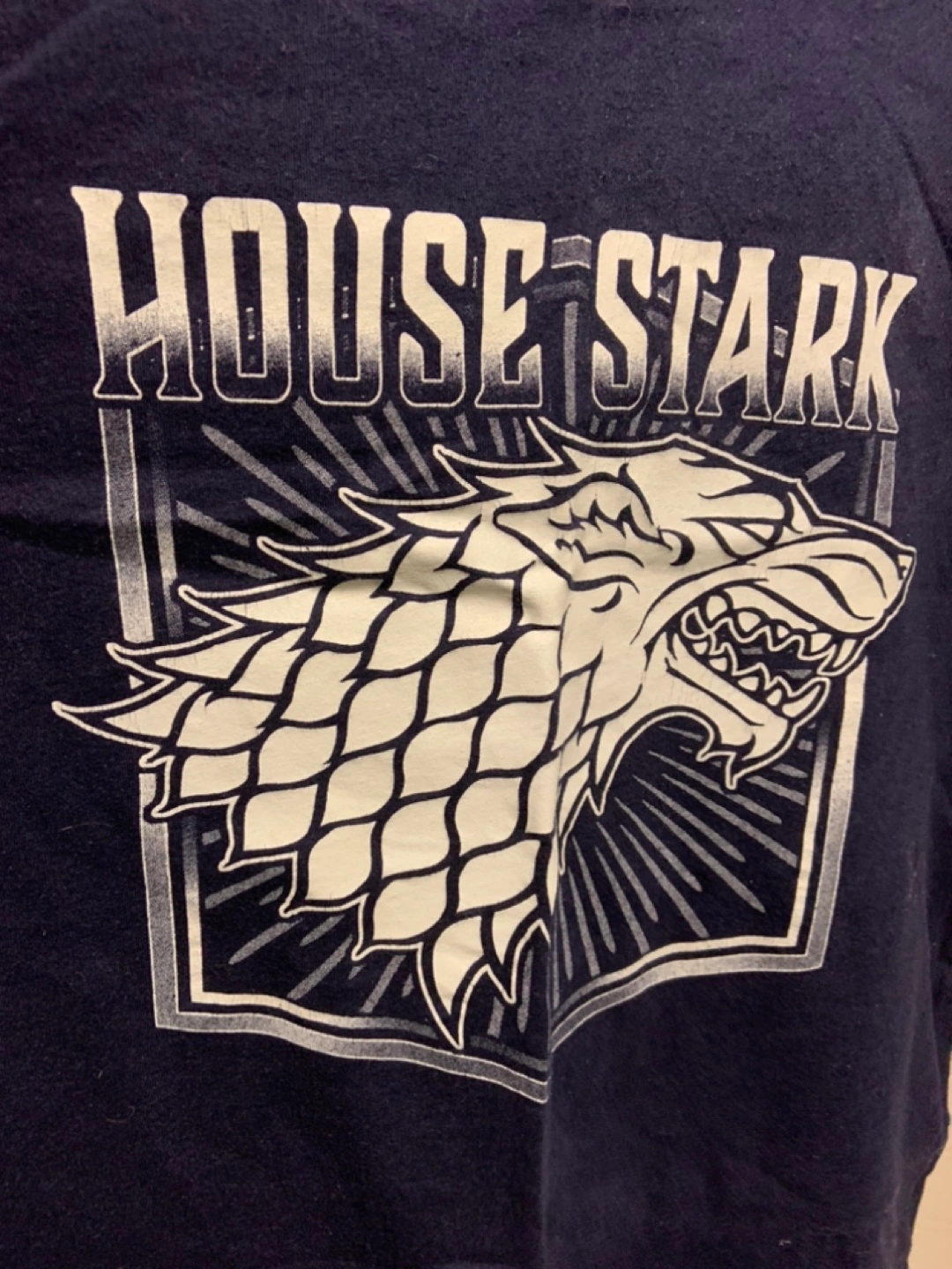 #freecycle Game of Thrones t-shirt featuring the House Stark sigil. The shirt is navy blue and has a graphic print of the direwolf sigil with 'HOUSE STARK' printed above it. It's in good condition but part of the white printing has small cracks. Men’s small size.
