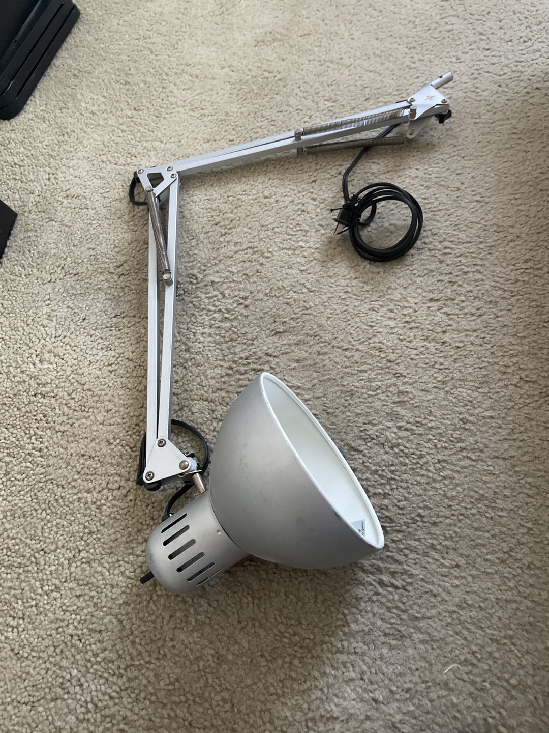 Selling a silver adjustable desk lamp. It's in good condition and perfect for a desk or workspace. The lamp has an adjustable arm and head, so you can easily direct the light where you need it