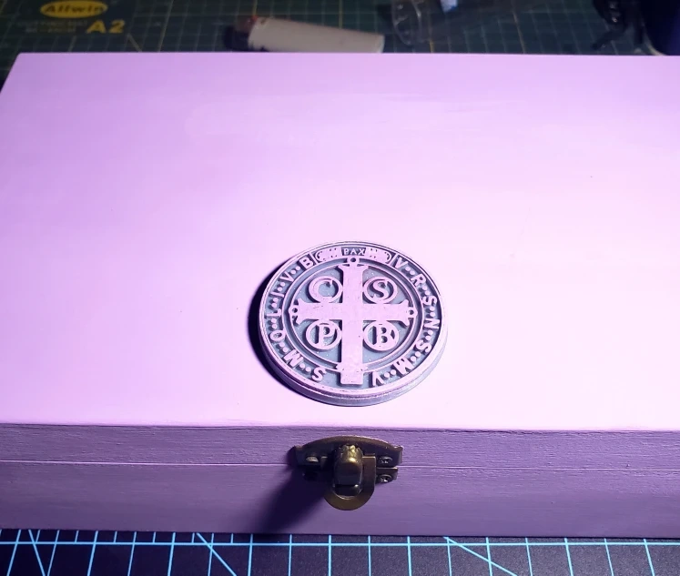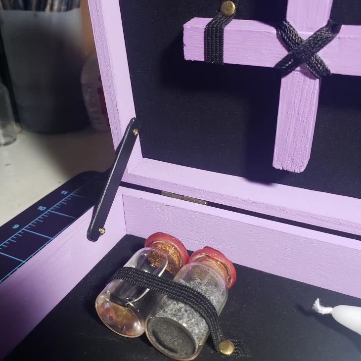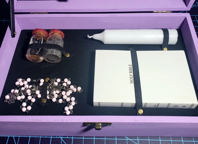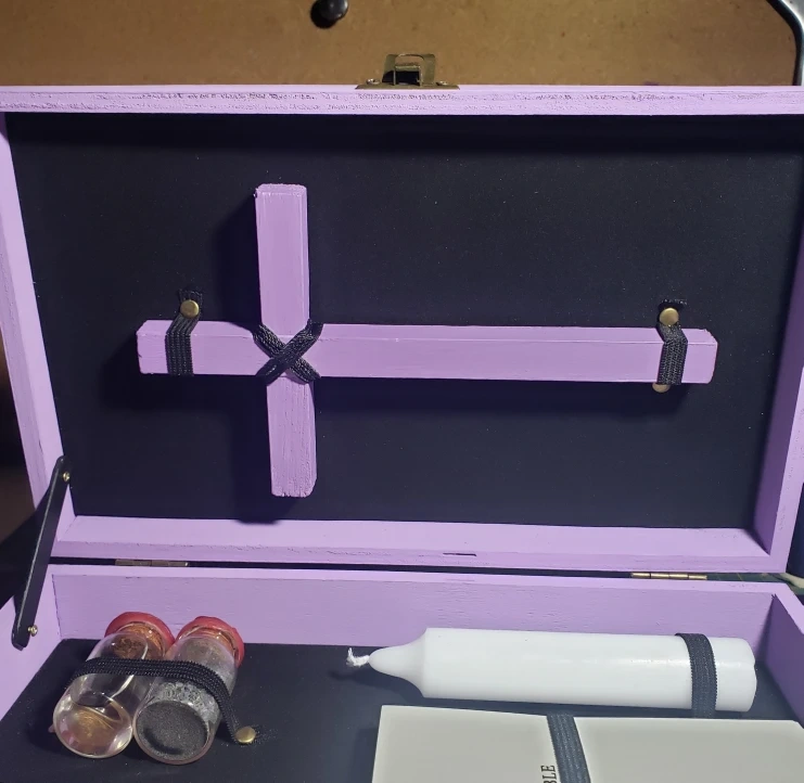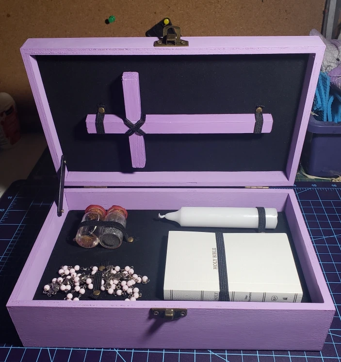 Purple Exorcism Kit-Cross, Roseary, Holy Water, Ashes And Bible in a 9x6x3 inch wooden Box. Perfect addition to any horror collection. For display purposes only. $40 pick up only Make sure to check out my other listings