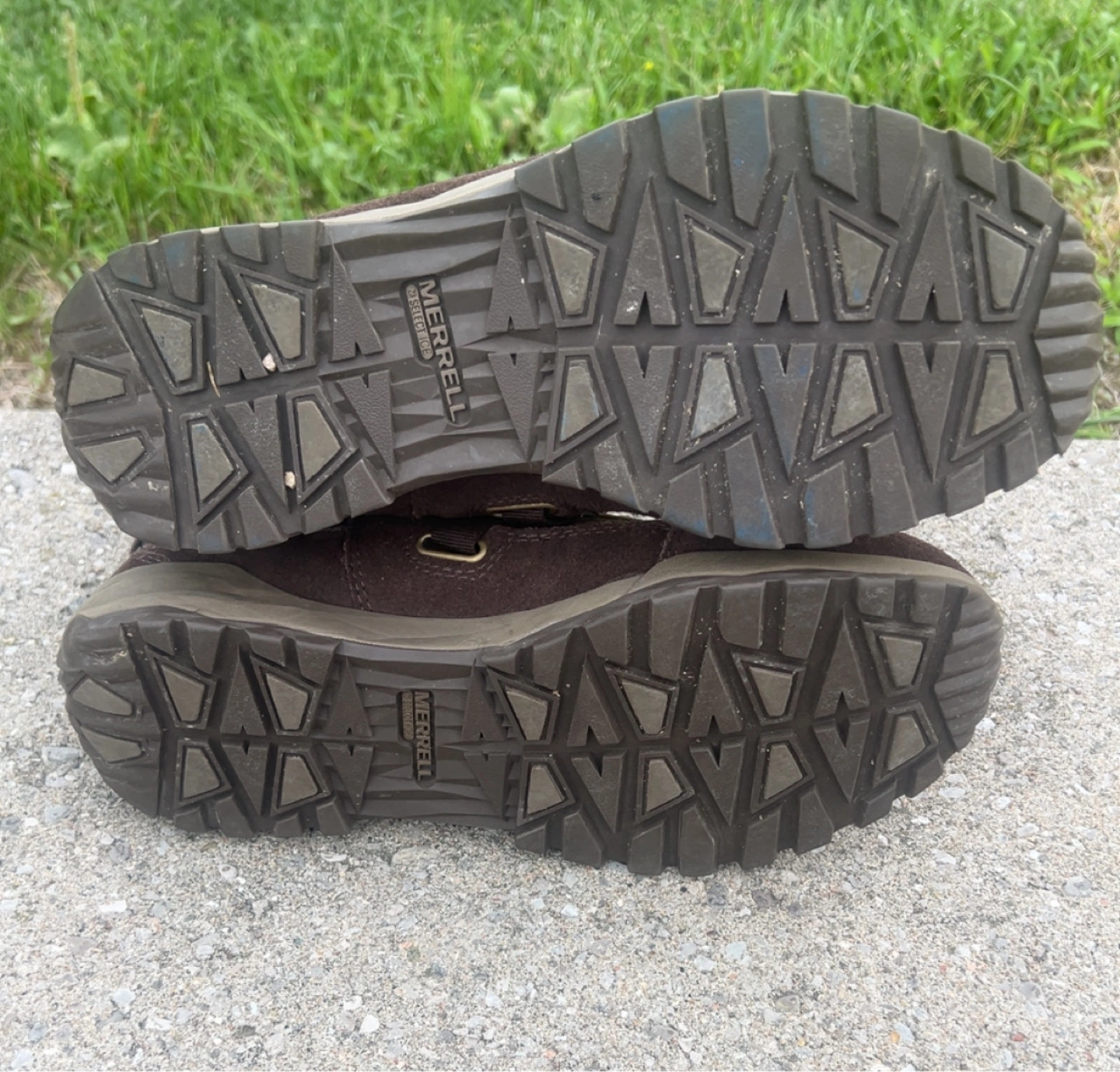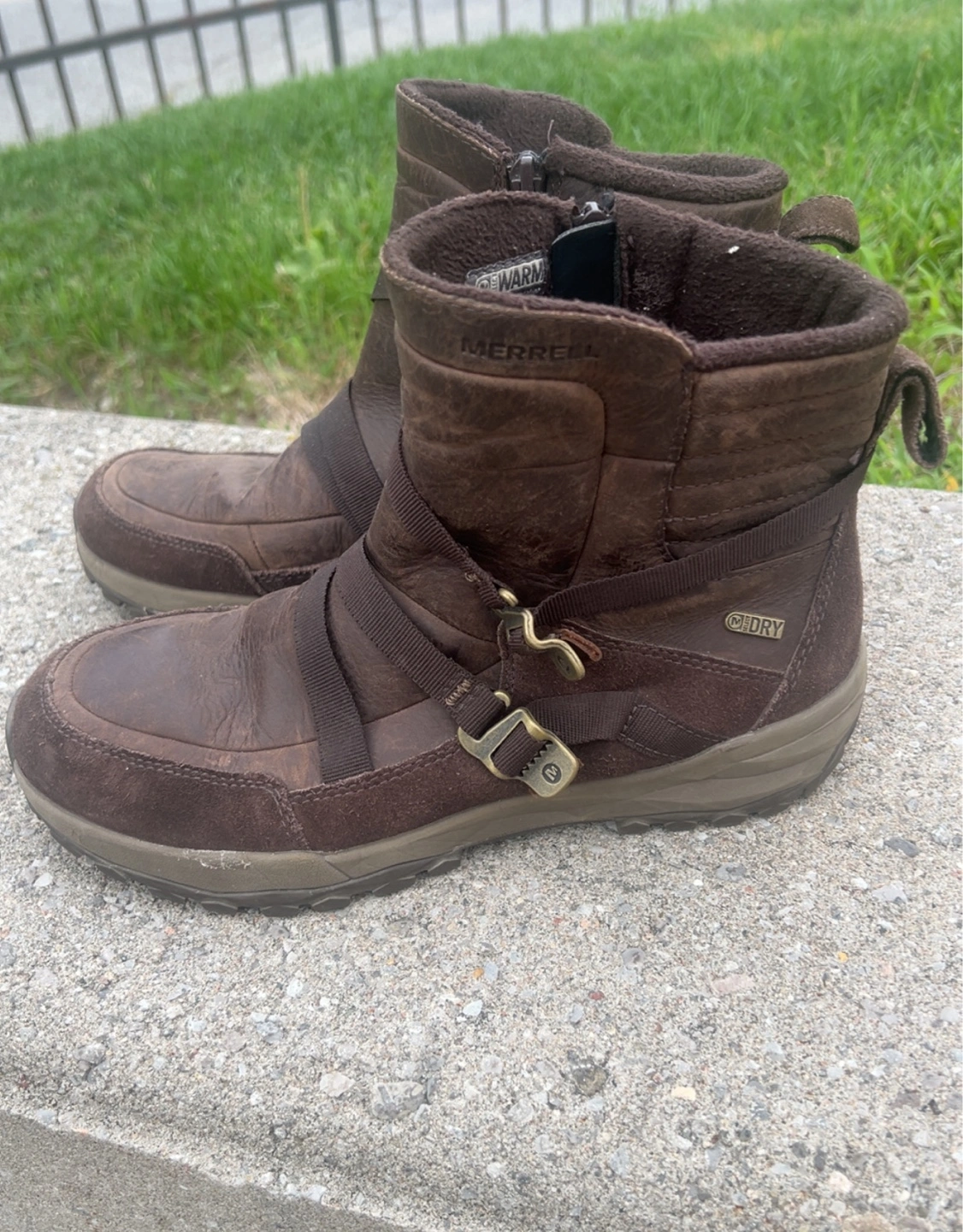A pair of brown Merrell winter boots. They feature a leather upper and a durable outsole. The boots have a convenient side zipper and adjustable straps for a secure fit.