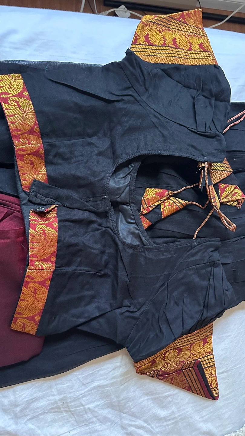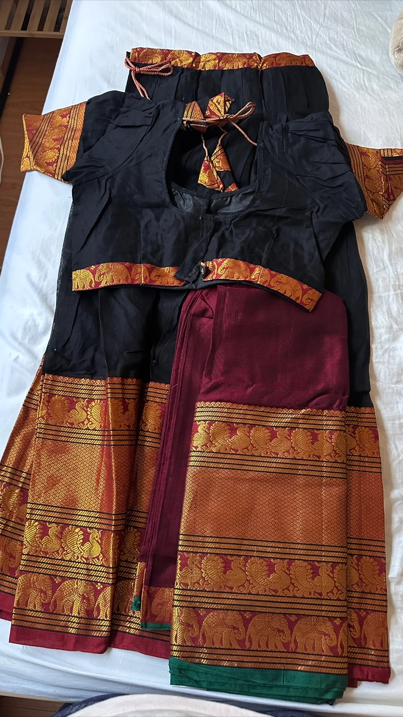 Selling a beautiful Indian traditional dress. The dress features a black top and skirt with intricate gold detailing, including elephant designs. It also comes with a maroon dupatta. The material feels like a soft, high-quality fabric. Perfect for cultural events or special occasions!