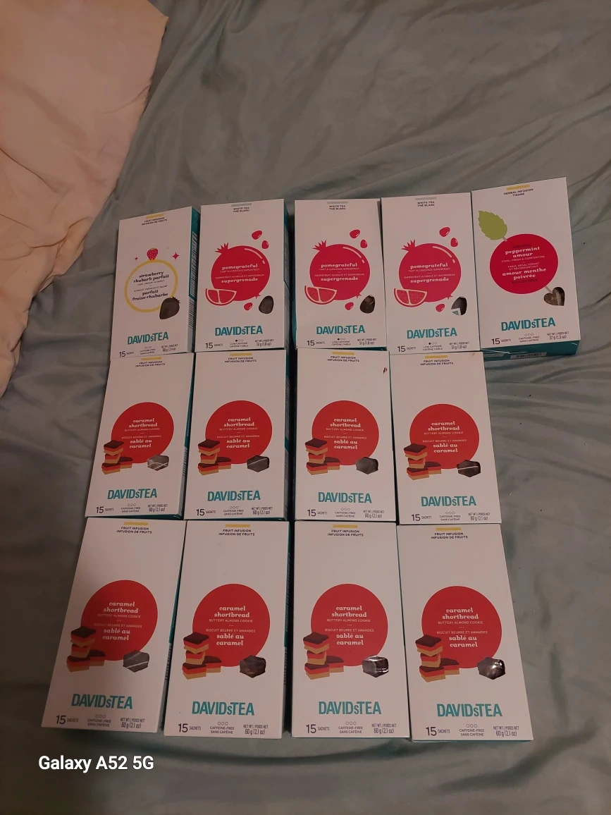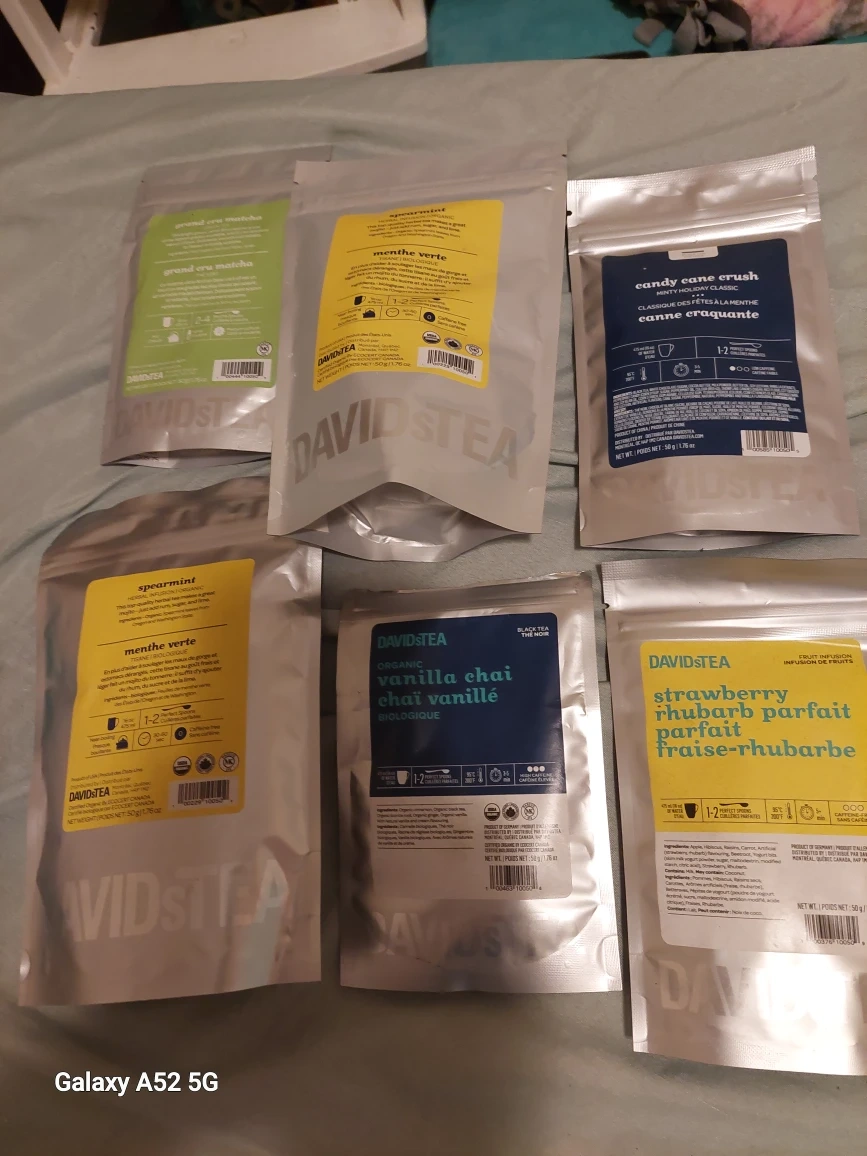 Free David's Tea-caramel shortbread ( 8 boxes 15 pkgs each)-peppermint amour(4 boxes 15 pkgs each)-1 box strawberry rhubarb parfait(15 pkgs). These are teabags 2 Lg pkg spearmint Loose tea 1small pkg strawberry rhubarb parfait 1 small pkg grand cru matcha 1 small pkg candy cane crush