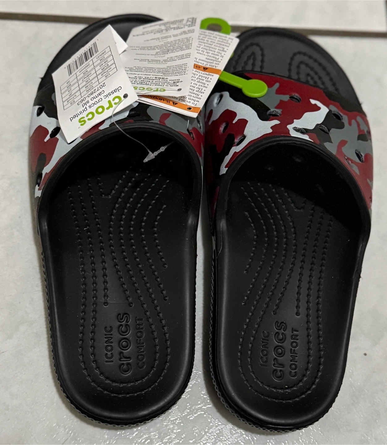 Check out these Crocs Classic Camo Printed Slides! They're sized EU39-40, which is a women's US size 7-9. Super comfy and stylish for those warm days