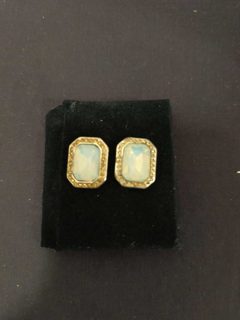 These are a pair of rectangle earrings with an opal like stone. They come in a box.