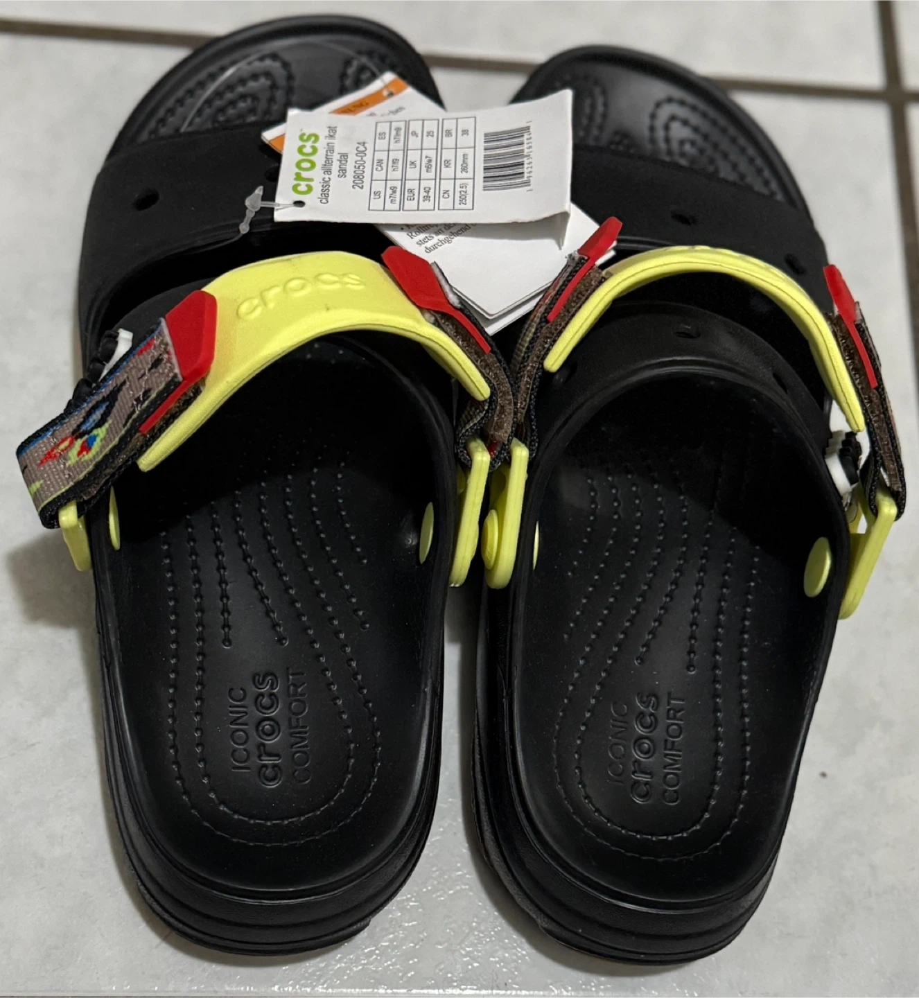 450These Crocs Classic All Terrain Ikat sandals are in great condition! They're a size M7/W9. The sandals are black with yellow straps and a colourful Ikat pattern. Perfect for all your adventures!