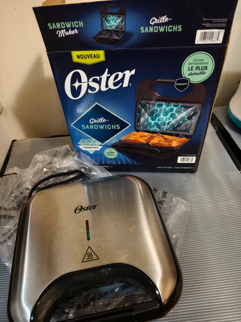 357Looking to sell my Oster DiamondForce Sandwich Maker with a stainless steel exterior! It's in great condition and comes with the original box. Makes perfect grilled sandwiches every time. only use 2 time
