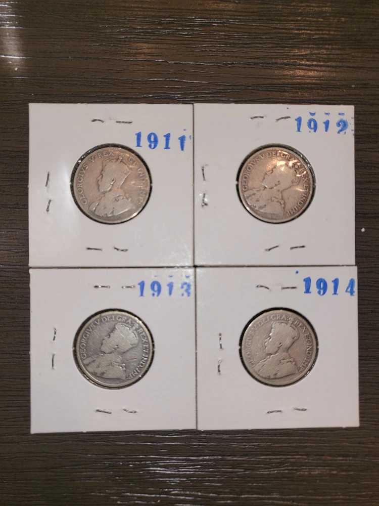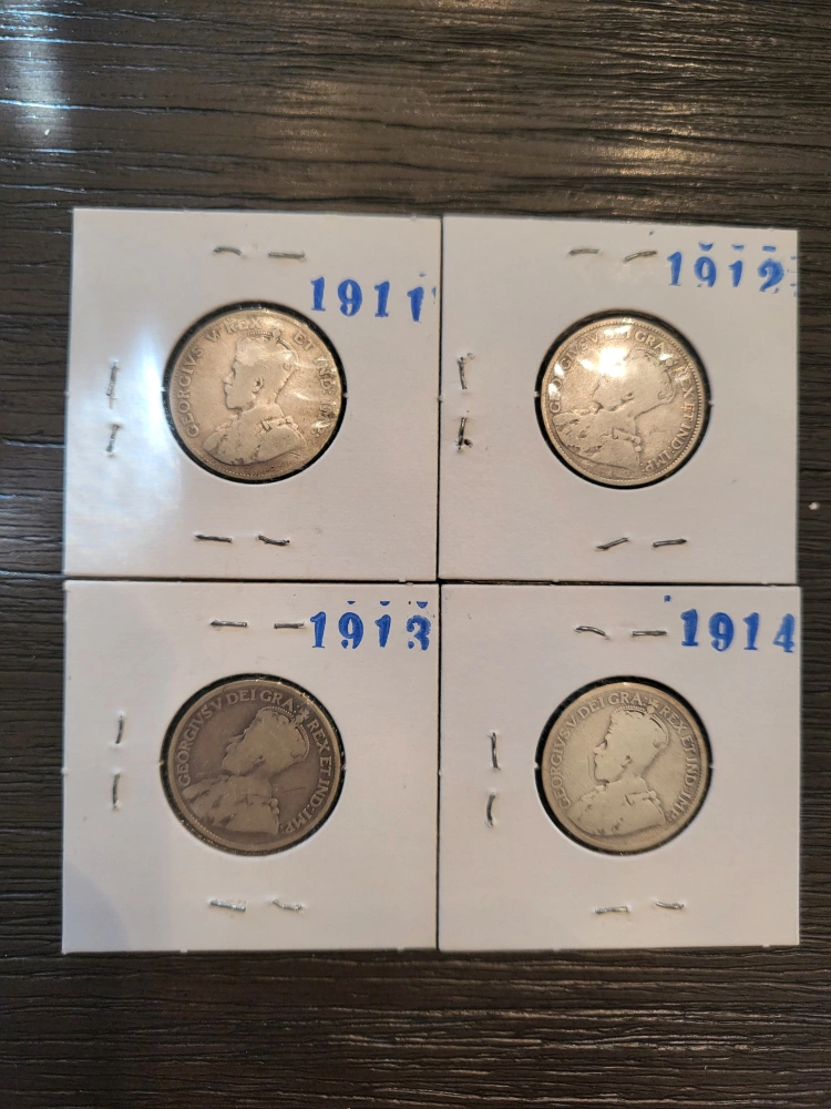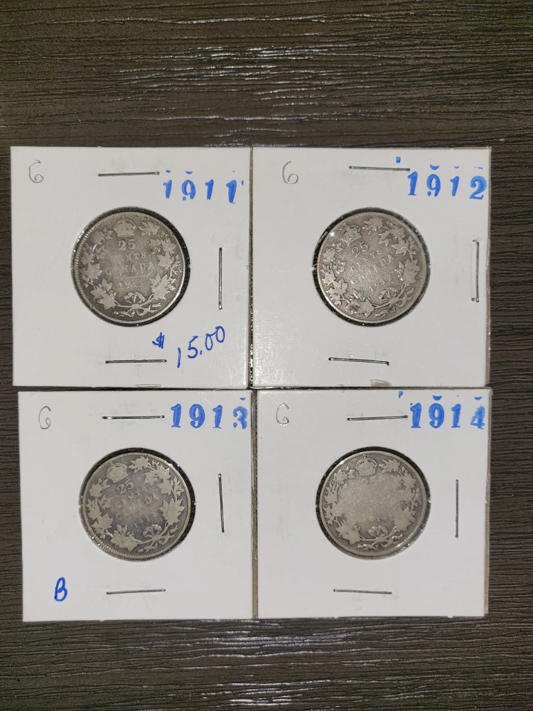 Selling a set of four vintage Canadian 25 cent coins. They are from the years 1911, 1912, 1913, and 1914.