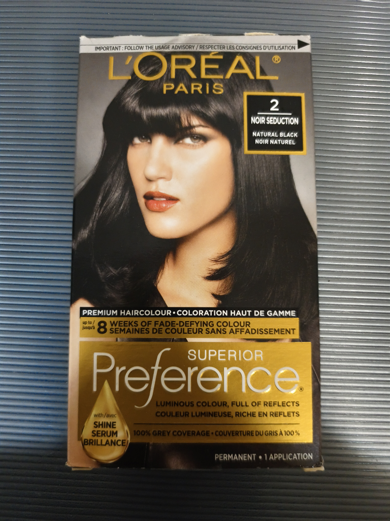 Selling a box of L'Oreal Paris Superior Preference hair colour in Noir Seduction (Natural Black). This is a premium hair colour that provides up to 8 weeks of fade-defying colour. It offers 100% grey coverage and is a permanent application. It also comes with shine serum for added brilliance!