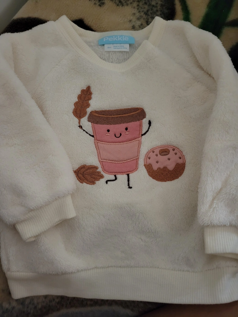 This is a super cute and cozy Pekkle fleece sweater for a little one! It's a size 9M and features an adorable coffee and donut design. Perfect for keeping your baby warm and stylish