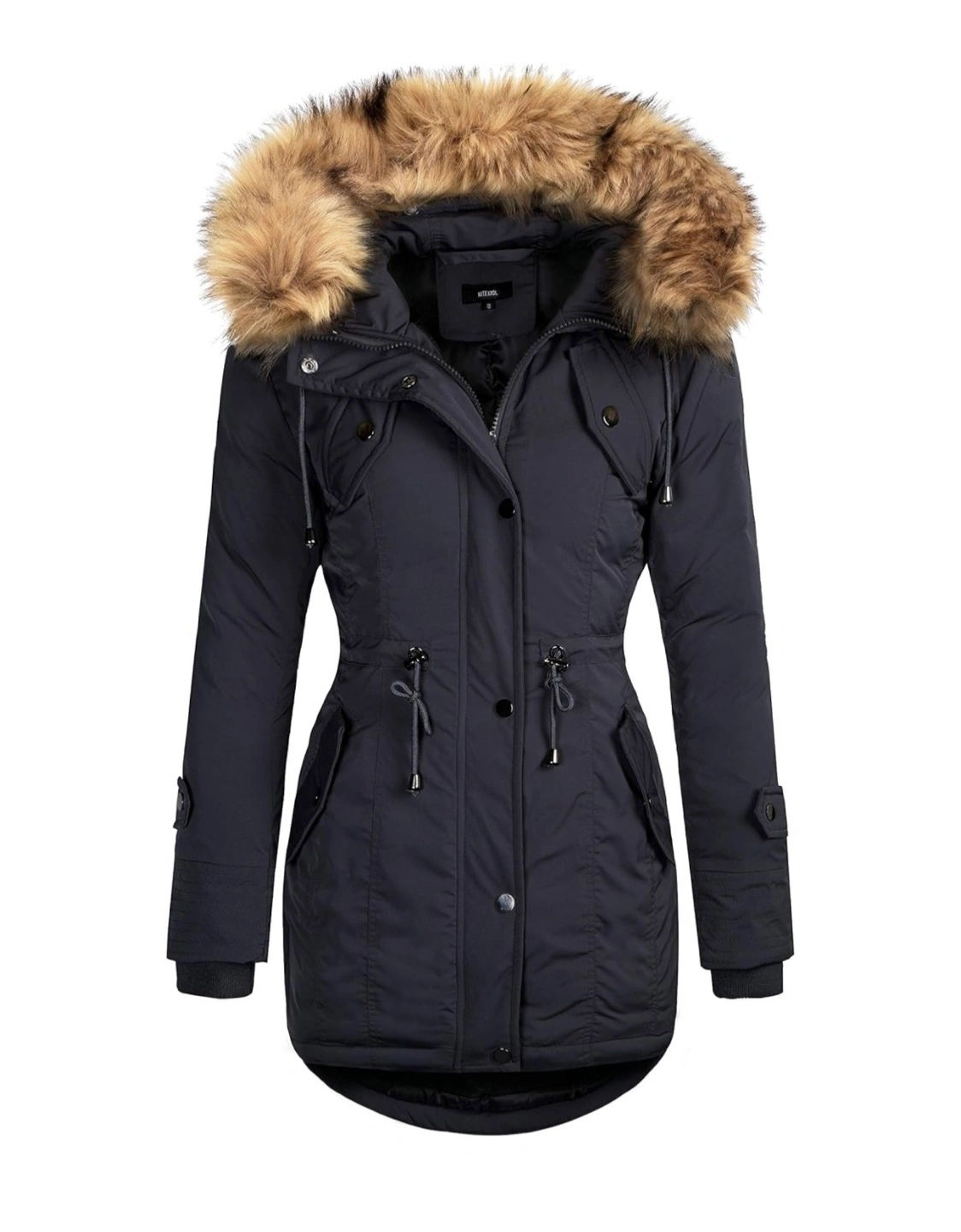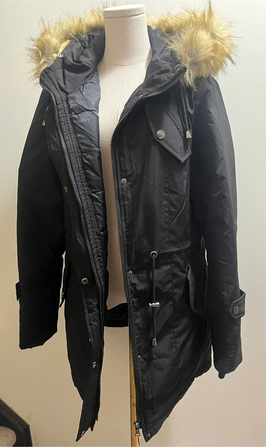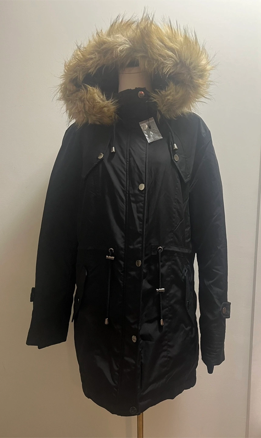 Here's a stylish black winter parka. It's perfect for staying warm during the colder months. The parka features a faux fur-trimmed hood and a comfortable, insulated lining.