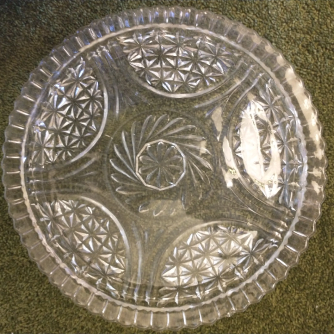 Selling a clear glass serving platter. It features a lovely starburst pattern and a scalloped edge. Perfect for displaying cakes or appetizers at your next gathering!