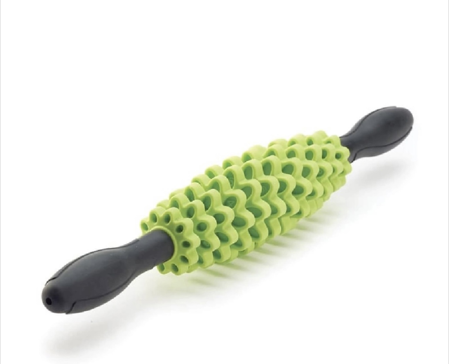 This is a green massage roller, perfect for working out those kinks and sore muscles. It's in great condition and ready to help you relax and recover after a workout or a long day. If you're looking for a simple and effective way to improve your muscle health, this roller is a great choice