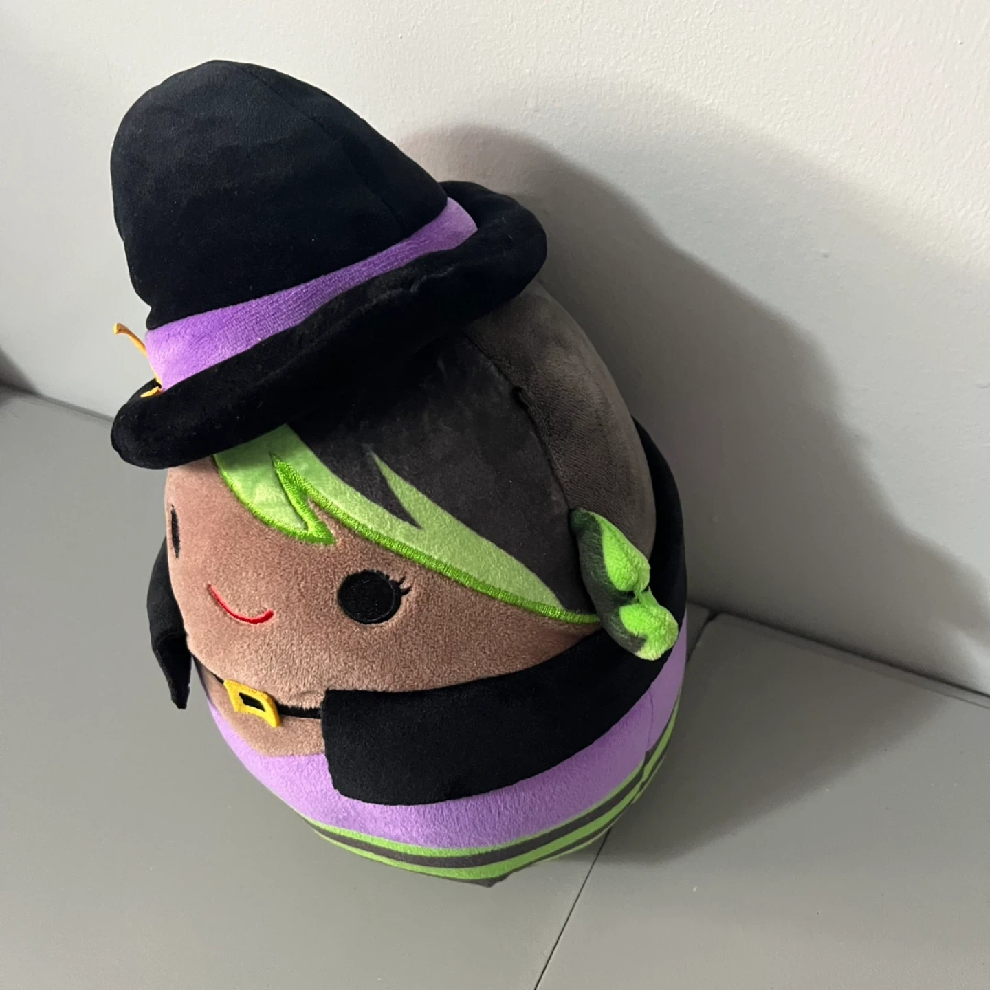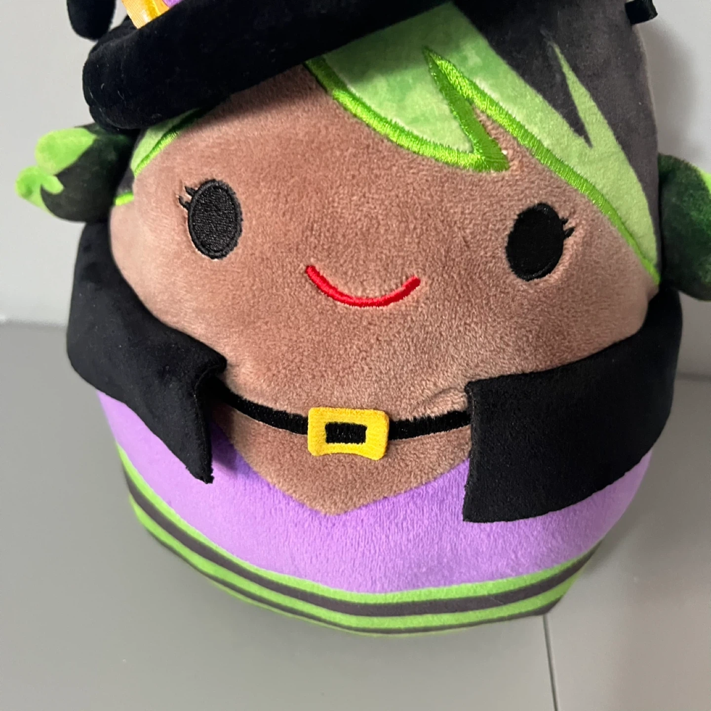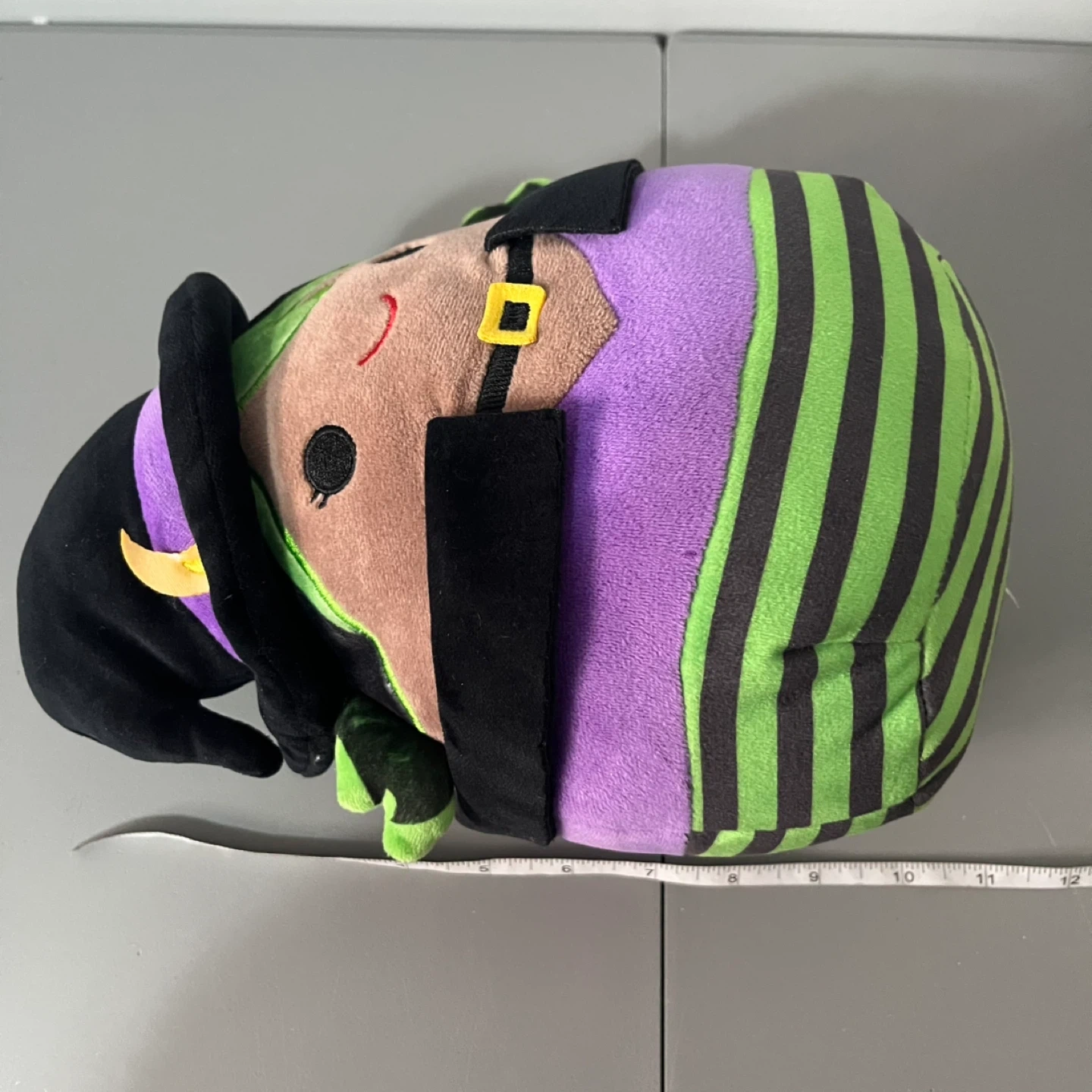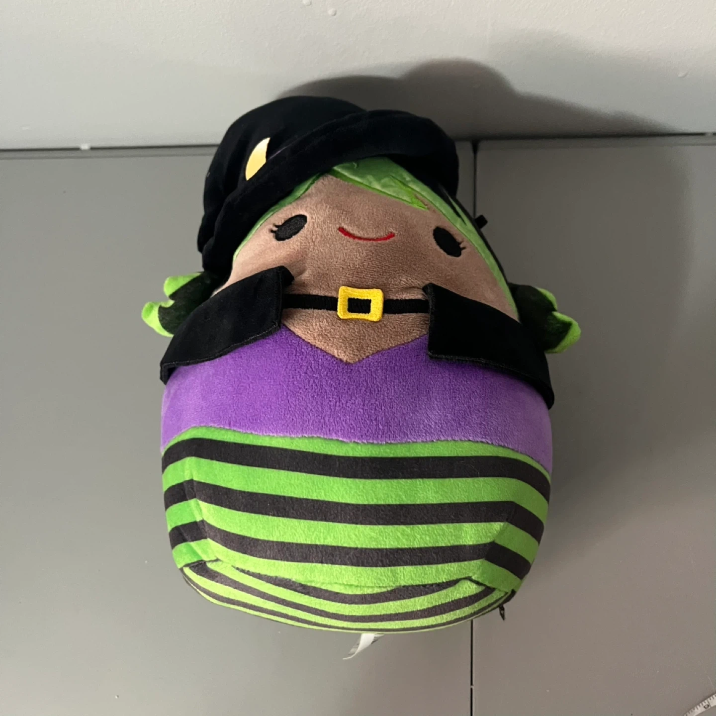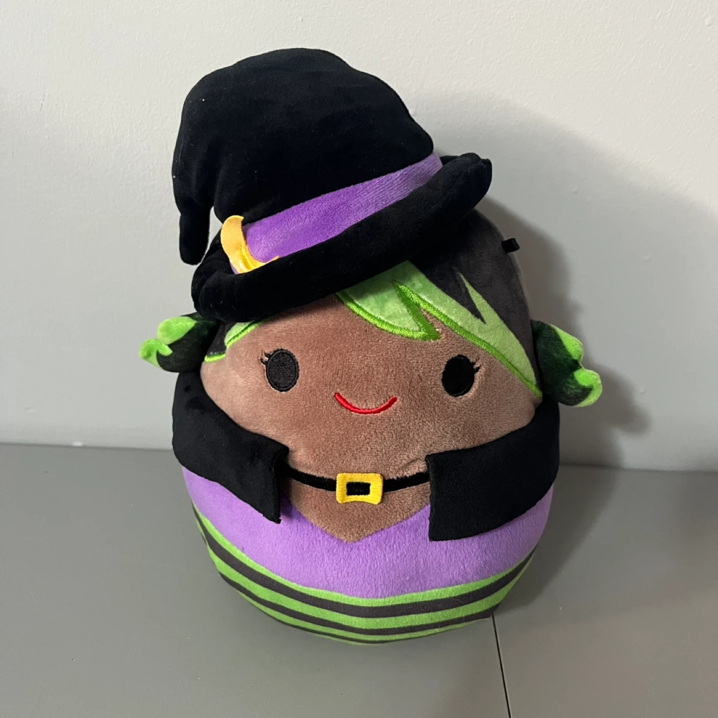 Here's a super cute Squishmallows plush named Autumn the Witch! It features a black witch hat with a purple band, green hair, and a black coat with a yellow buckle. The bottom part has green and black stripes on a purple background. Perfect for Halloween or any time of year!