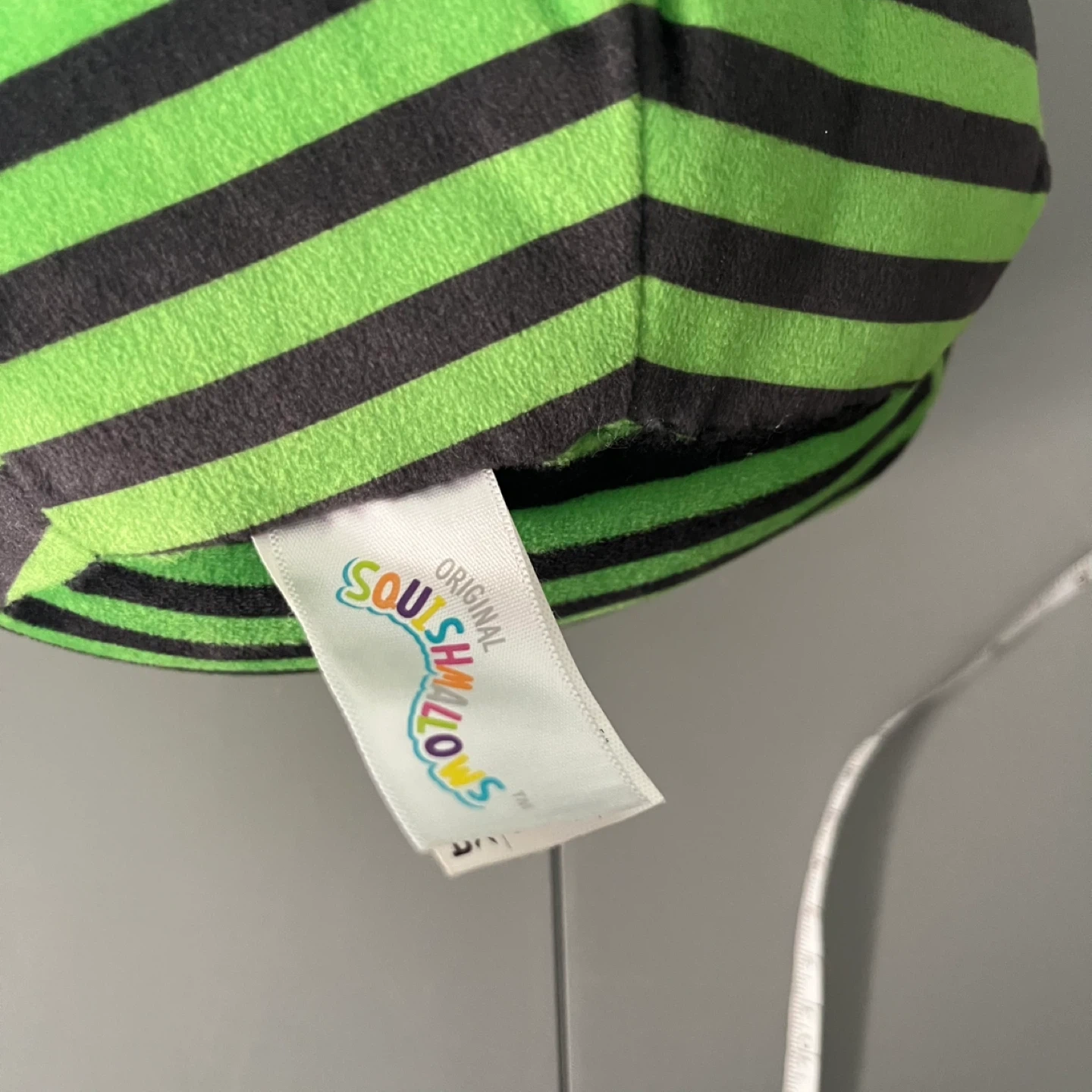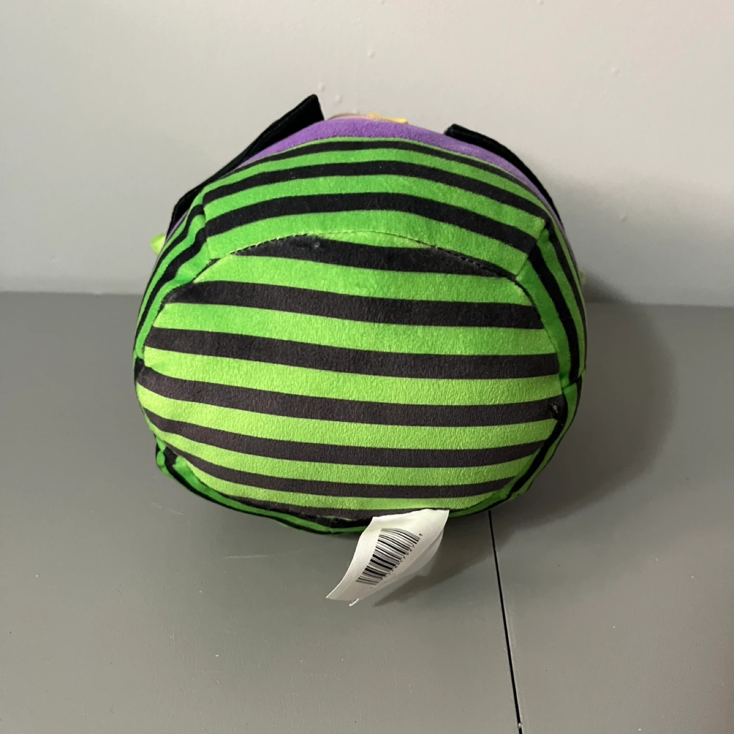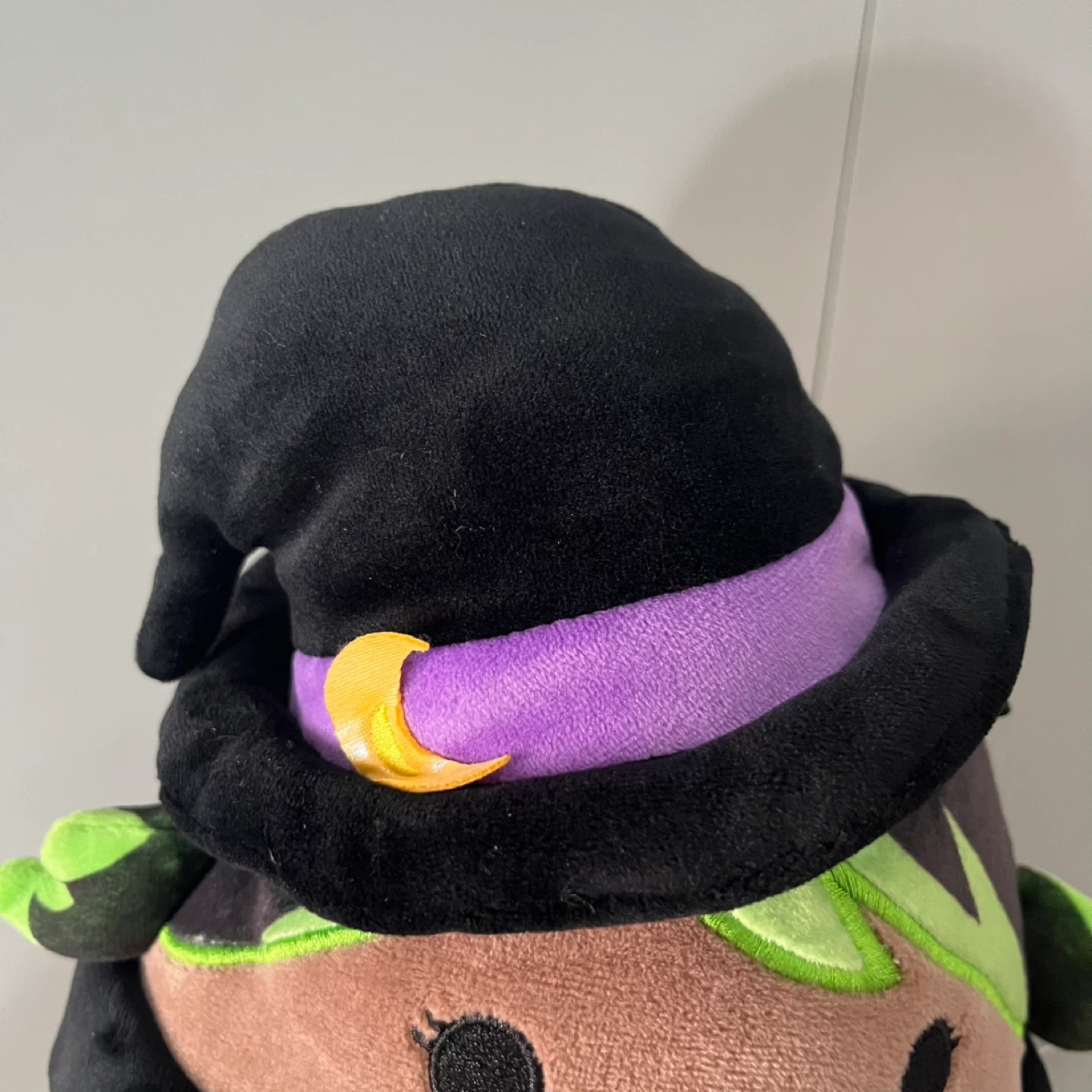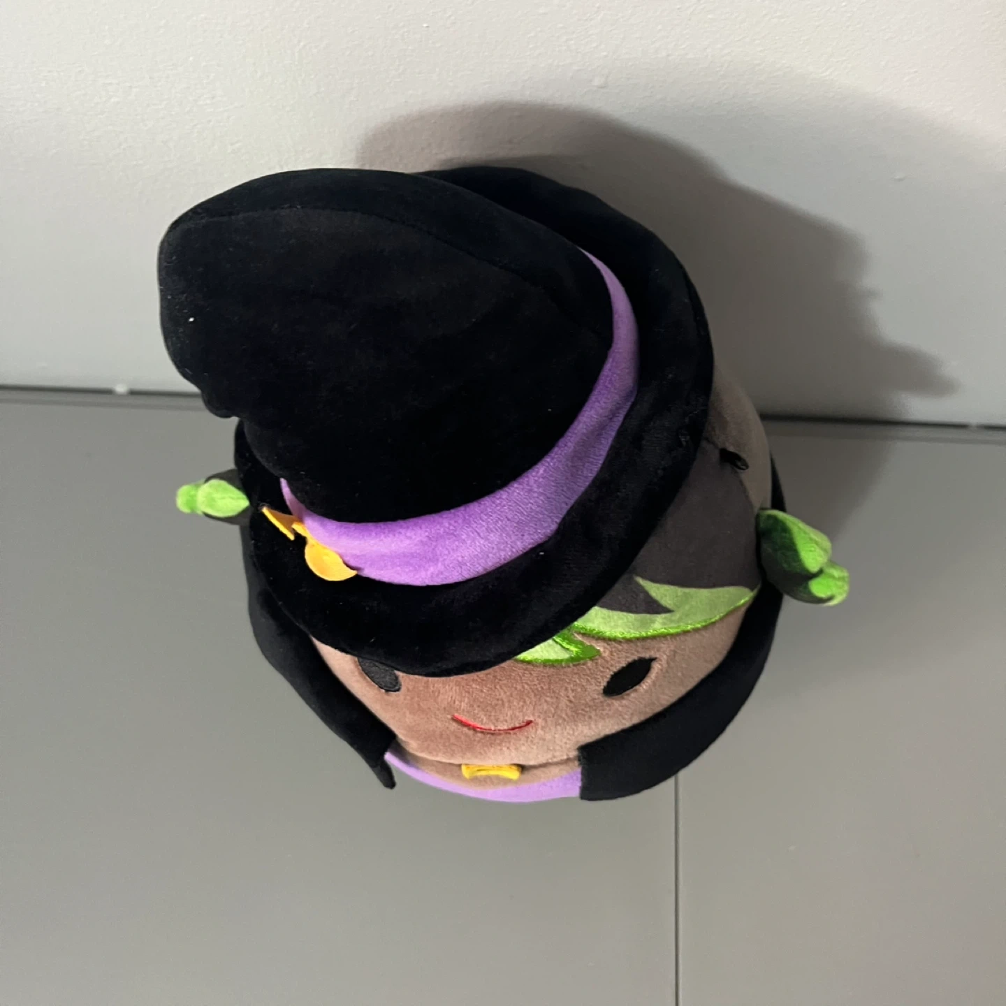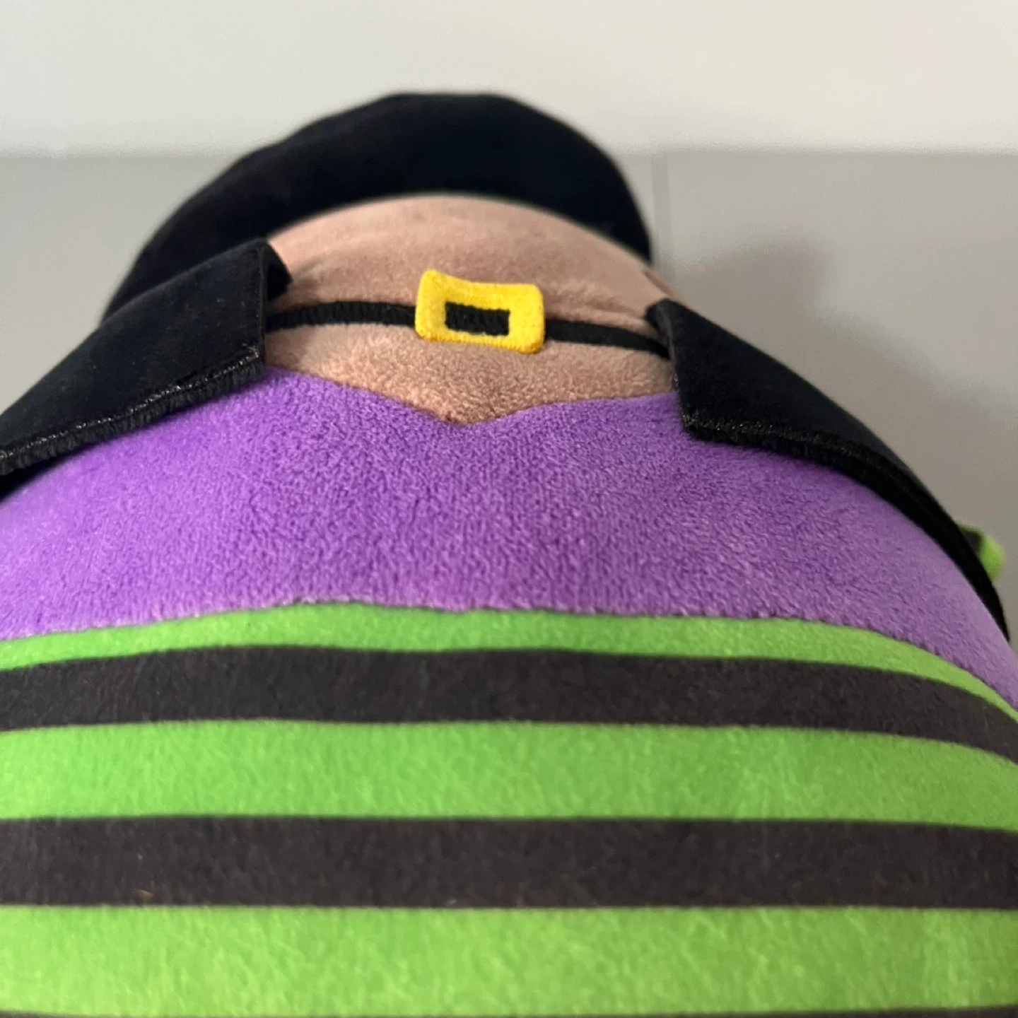 Here's a super cute Squishmallows plush named Autumn the Witch! It features a black witch hat with a purple band, green hair, and a black coat with a yellow buckle. The bottom part has green and black stripes on a purple background. Perfect for Halloween or any time of year!