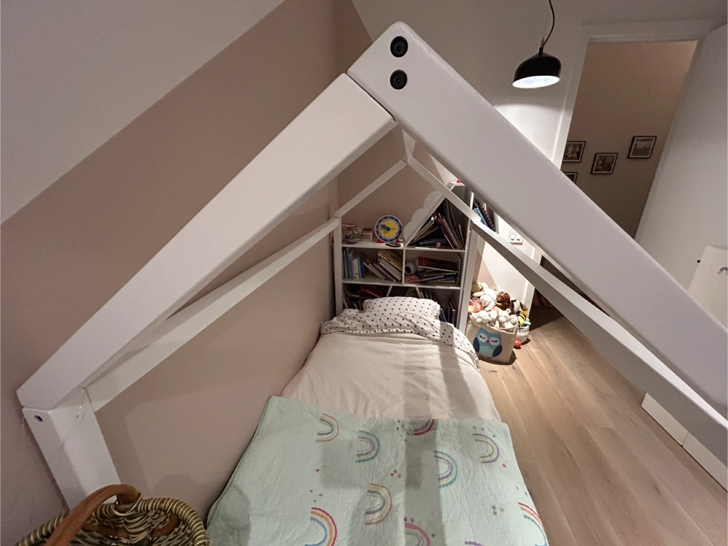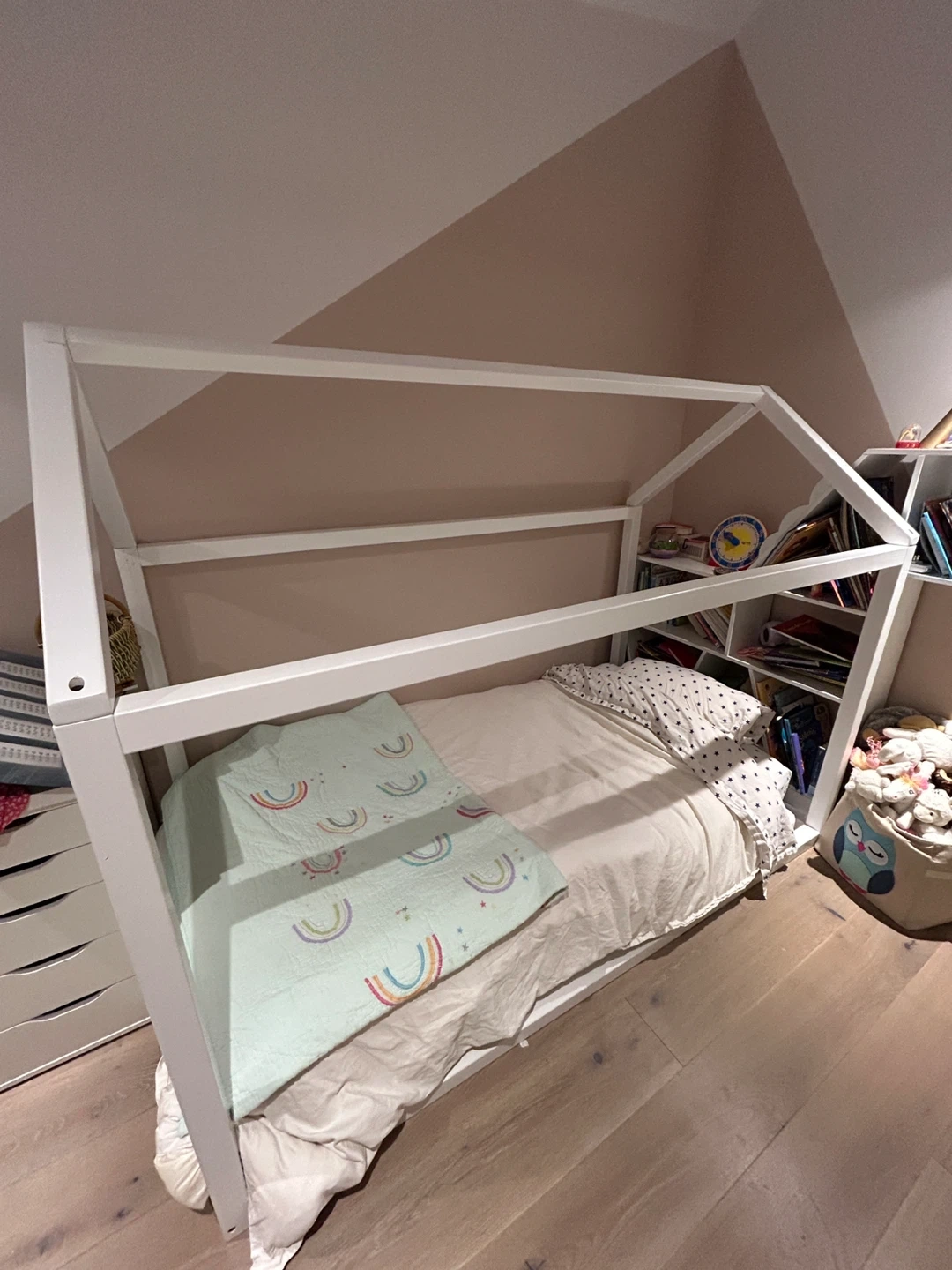 Selling a beautiful white house bed frame. It's in great condition and very solid. Bought in an Ontario store (*not* from Amazon or Wayfair, 3 years old, but it’s time to move on! Twin mattress size: please note the mattress is not included but the boxspring is. Width: 75" Height: 61" Depth: 38" Pick up exclusively in the Beaches at Queen and Victoria Park.