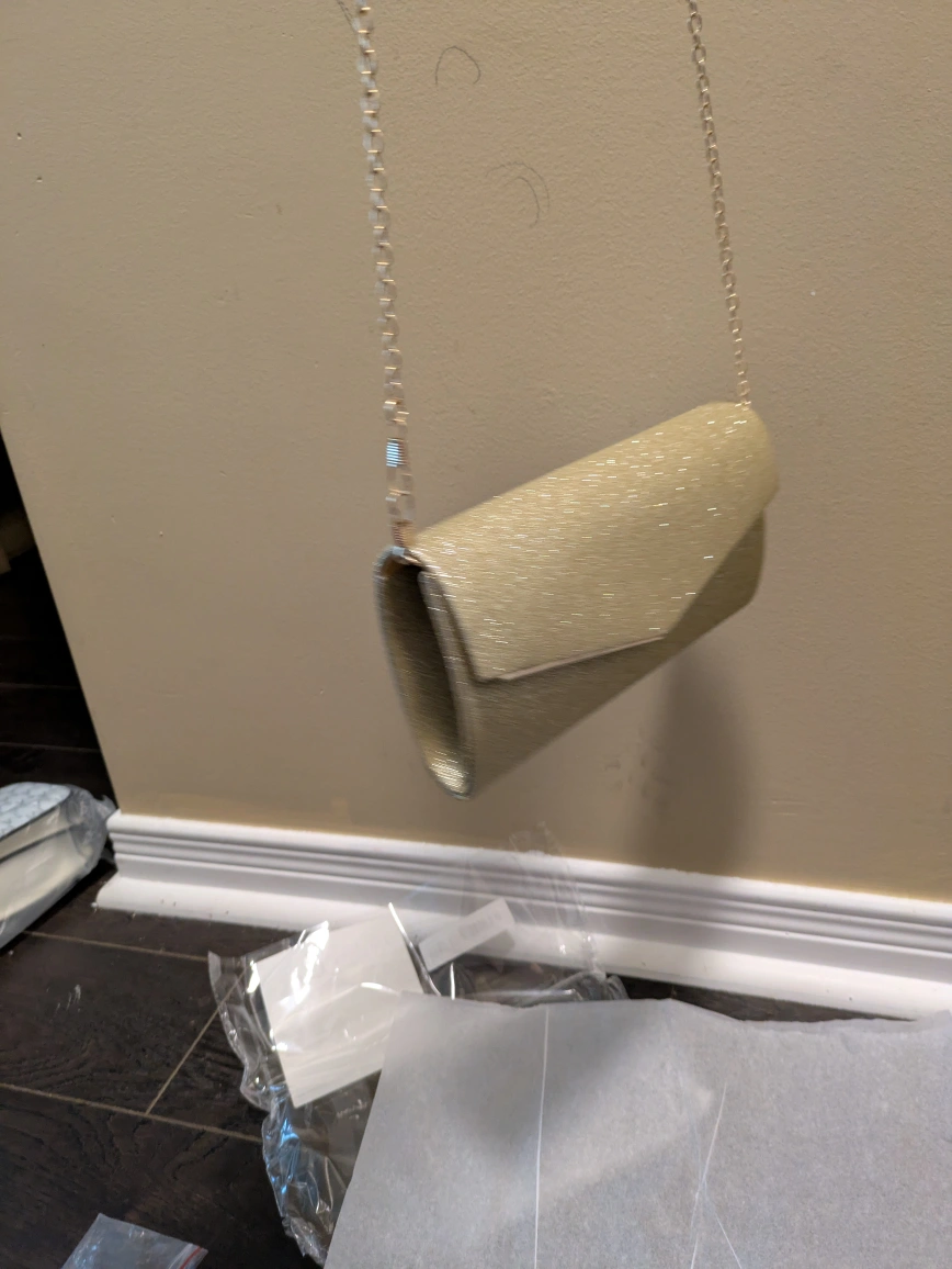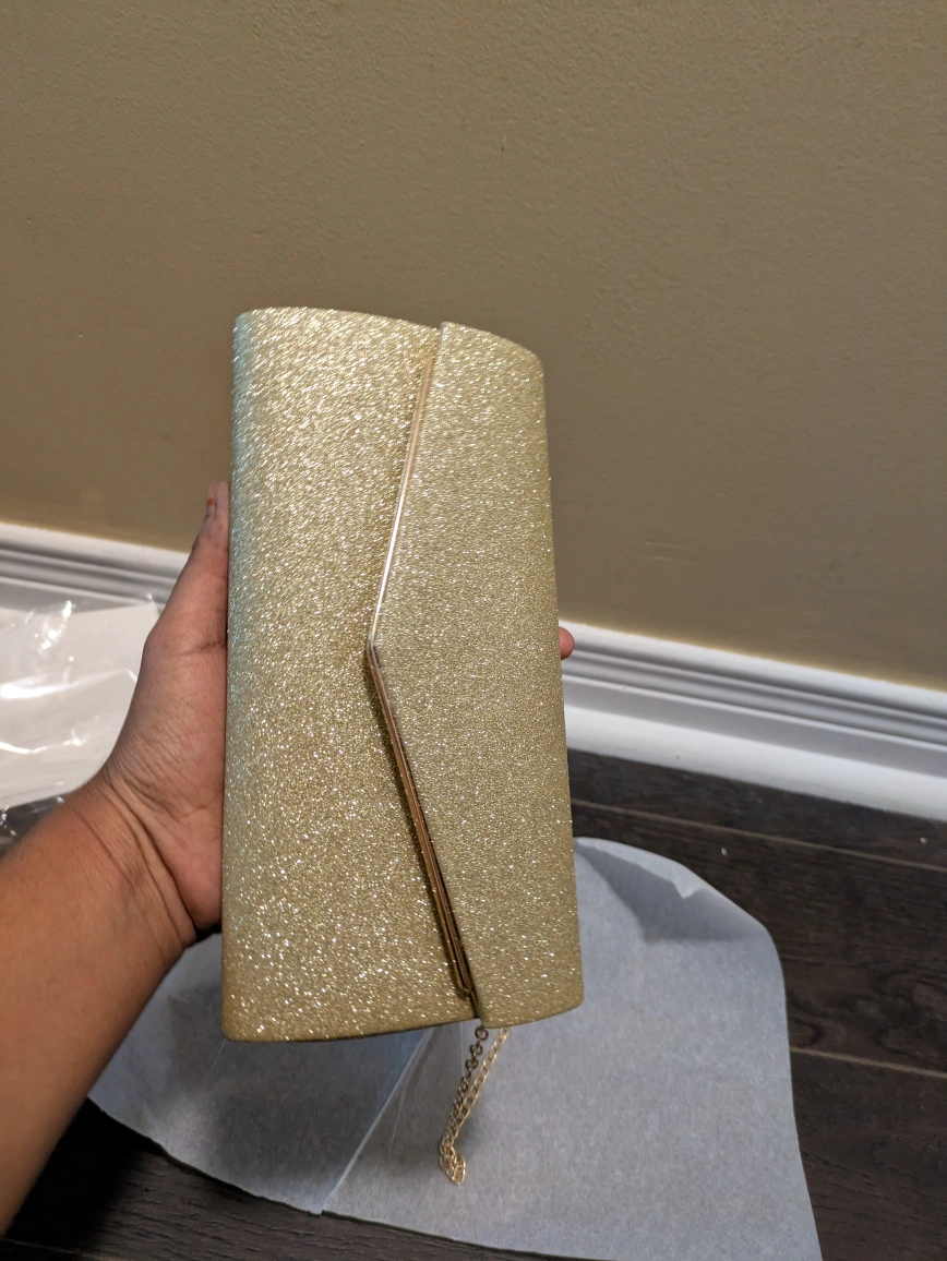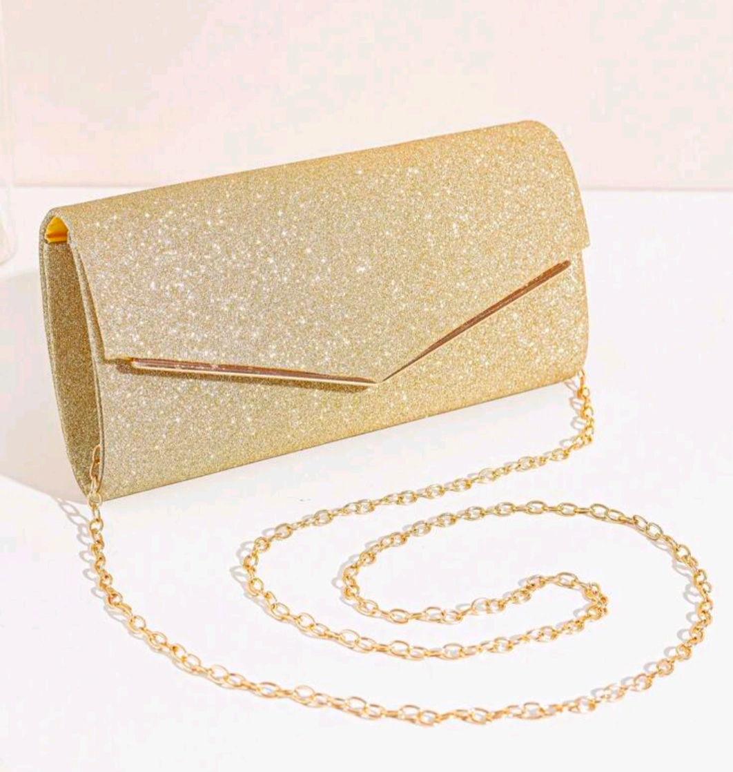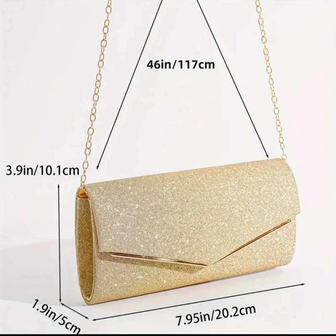 46This is a beautiful gold glitter clutch, perfect for a night out or special occasion! It comes with a delicate chain strap. The dimensions are approximately 7.95 inches (20.2cm) in length, 3.9 inches (10.1cm) in height, and 1.9 inches (5cm) in width. The strap drop is about 46 inches (117cm)