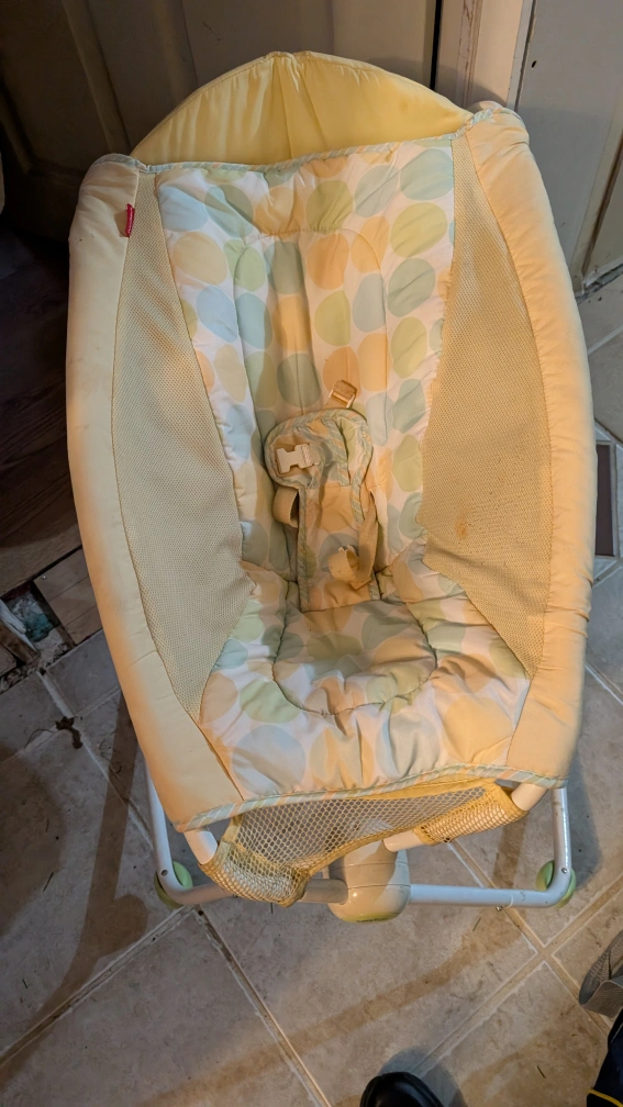 Selling a gently used Fisher-Price baby bouncer. It's in good condition and ready for a new little one! The bouncer features a soft, padded seat and a secure harness to keep your baby comfortable and safe. Perfect for soothing and entertaining your little one