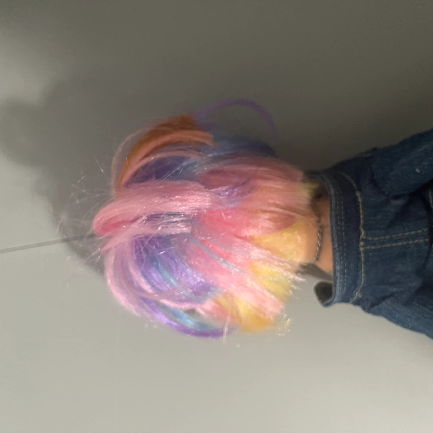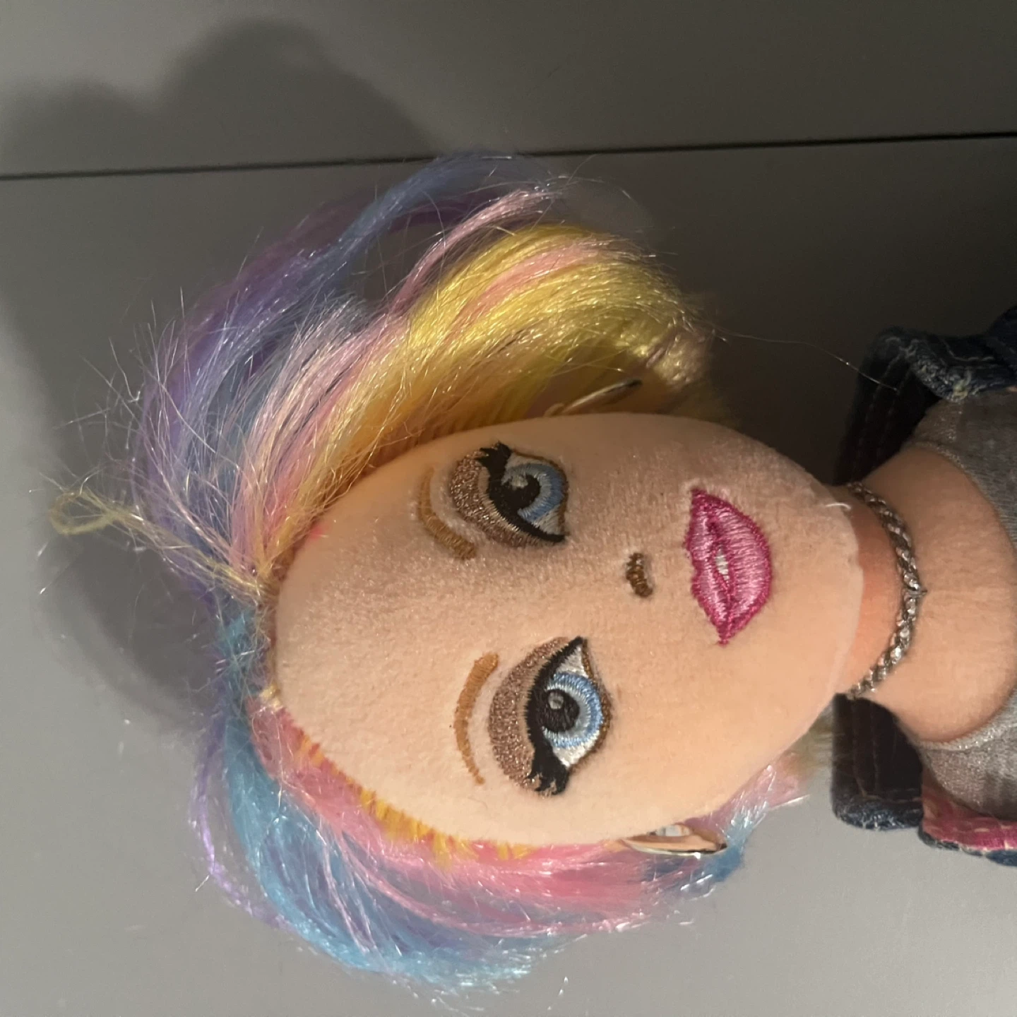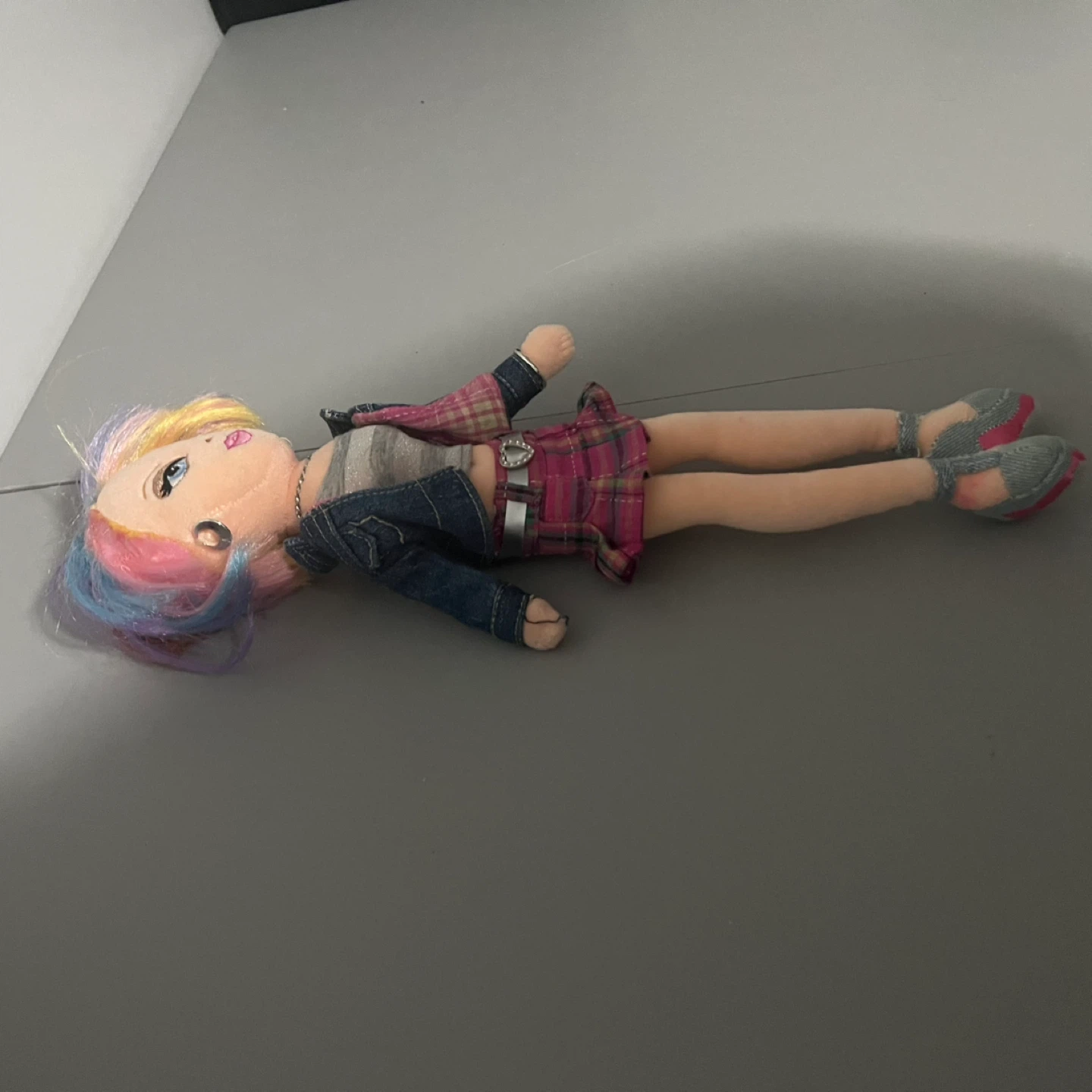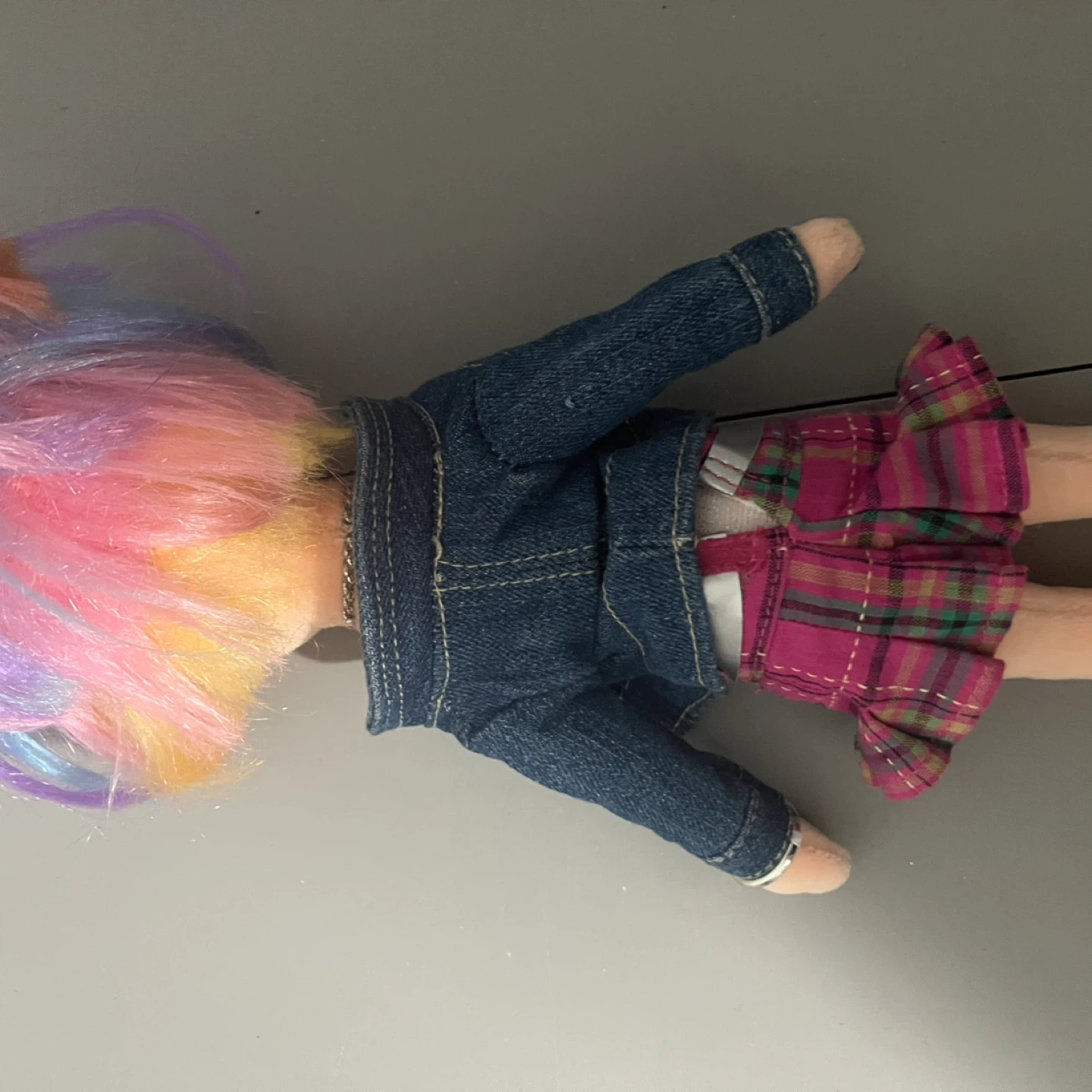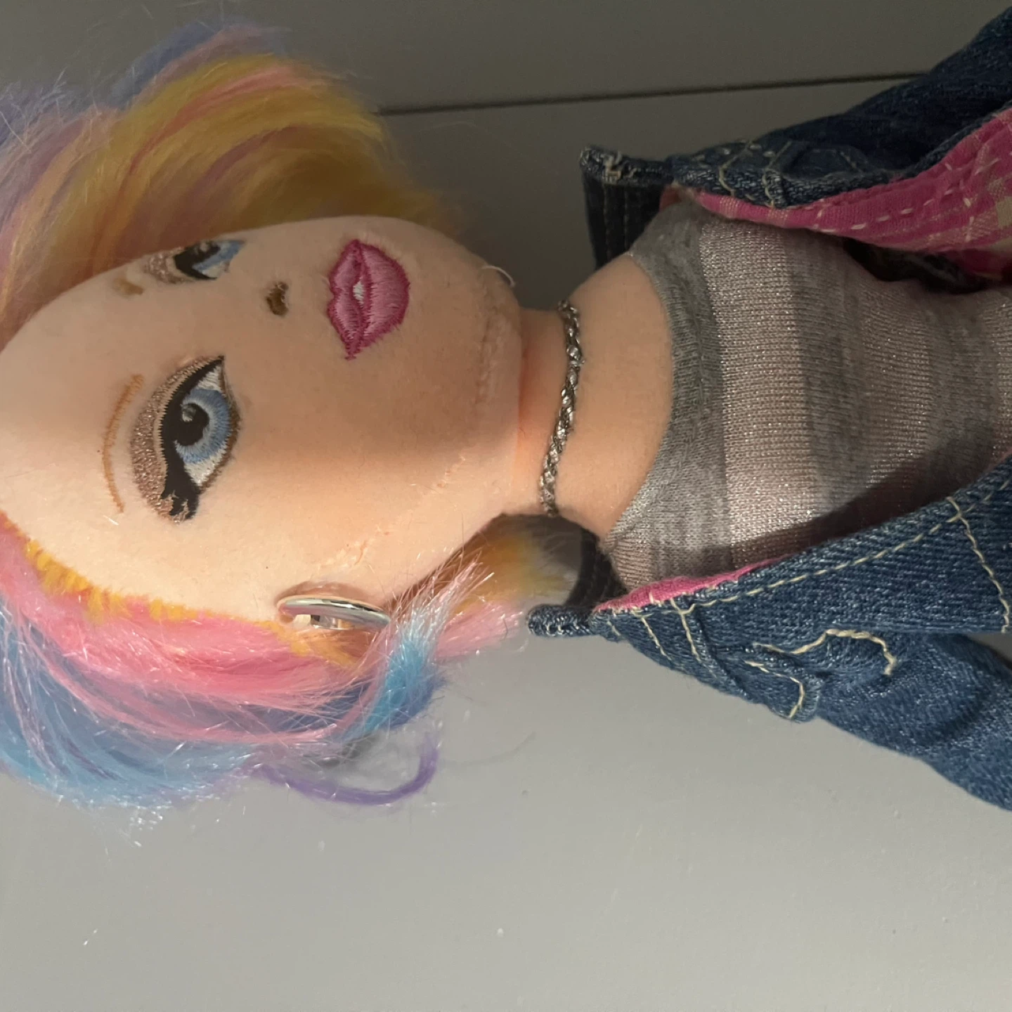 Selling a cute plush fashion doll! It's wearing a stylish denim jacket, a striped top, and a plaid skirt. The doll has colourful hair and detailed facial features. A great addition to any doll collection!