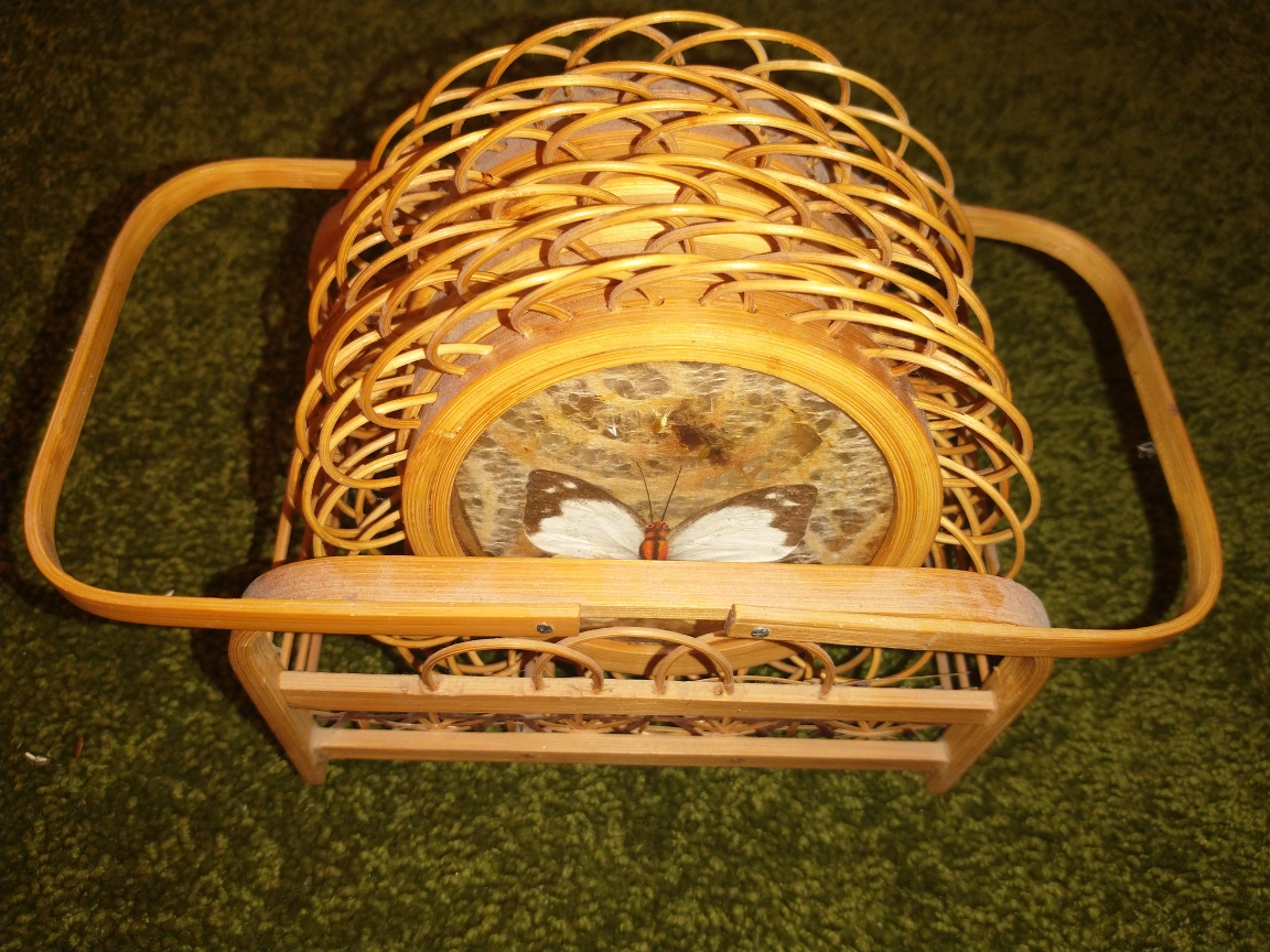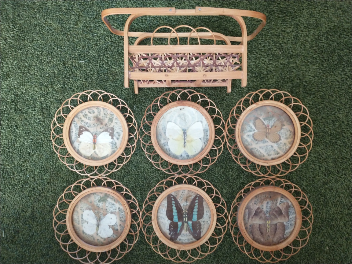 Selling a set of vintage butterfly coasters with a cute holder! These coasters feature different butterfly designs in a woven bamboo-style frame. Perfect for adding a touch of retro charm to your home decor.