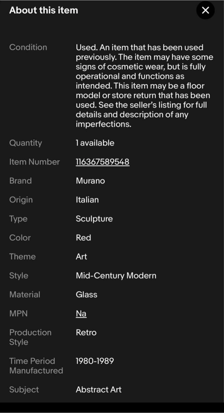 The use of high-quality glass material adds a touch of elegance and sophistication to this piece. It is perfect for adding a pop of color and a unique flair to any home decor. Whether you're an avid collector of Murano glass or simply looking for a statement piece, this sculpture is a must-have.