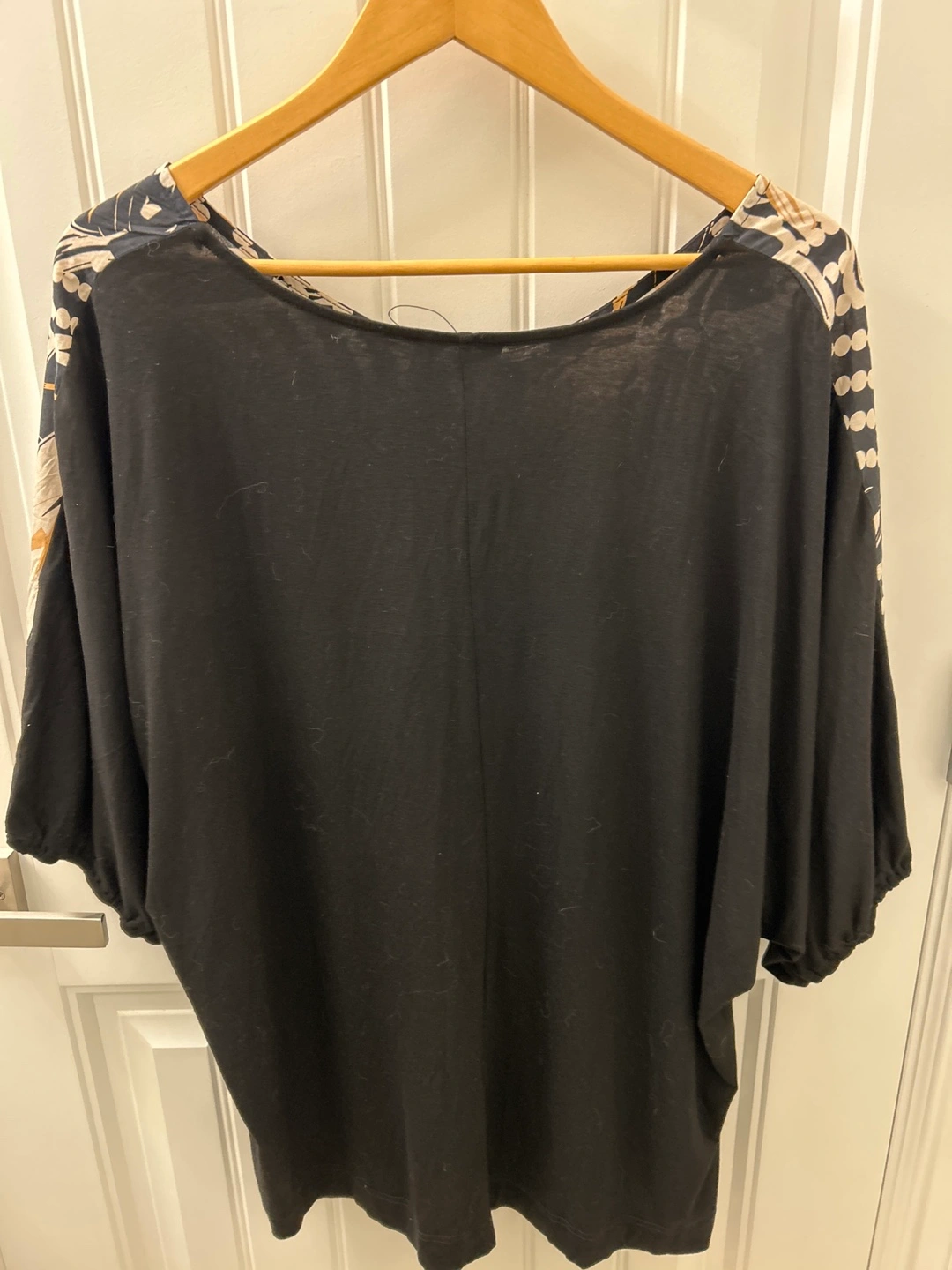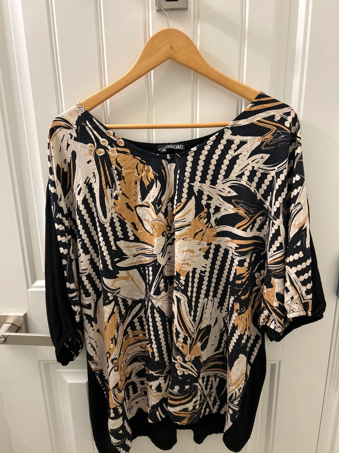 Selling a stylish Norah blouse in size 46! It features a unique pattern with black and gold accents. Perfect for adding a touch of flair to your wardrobe