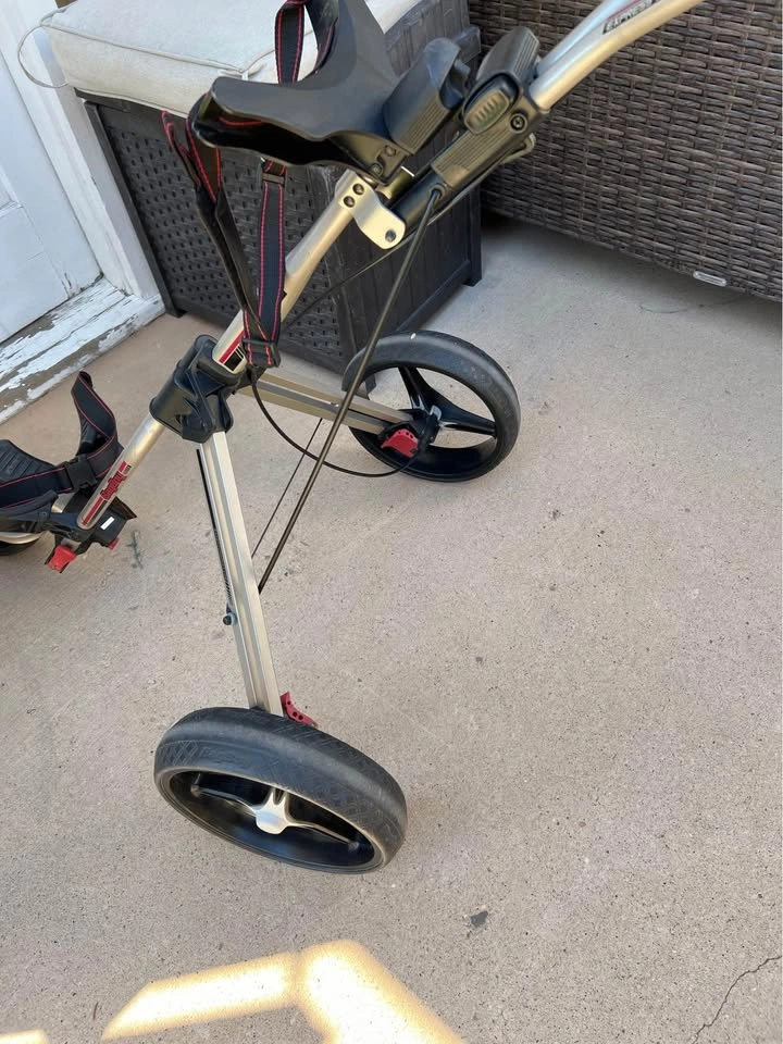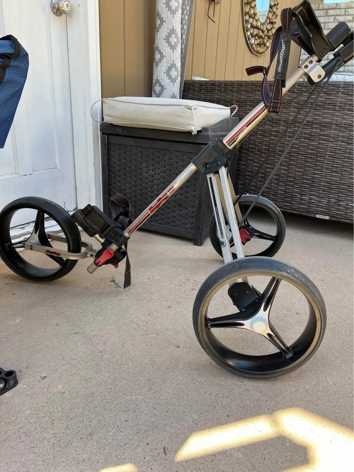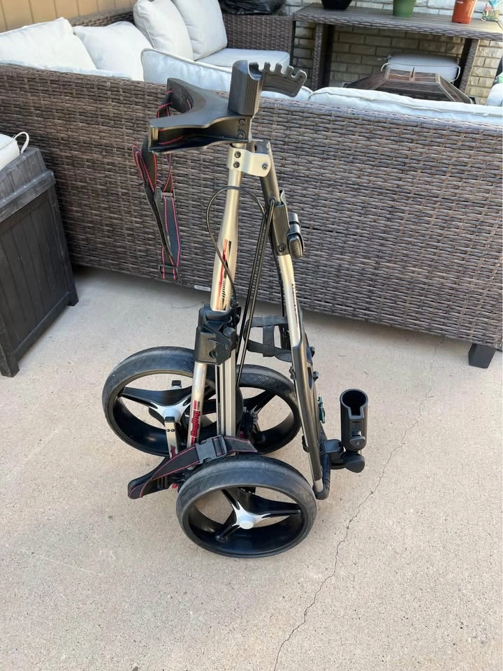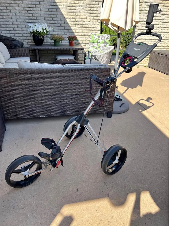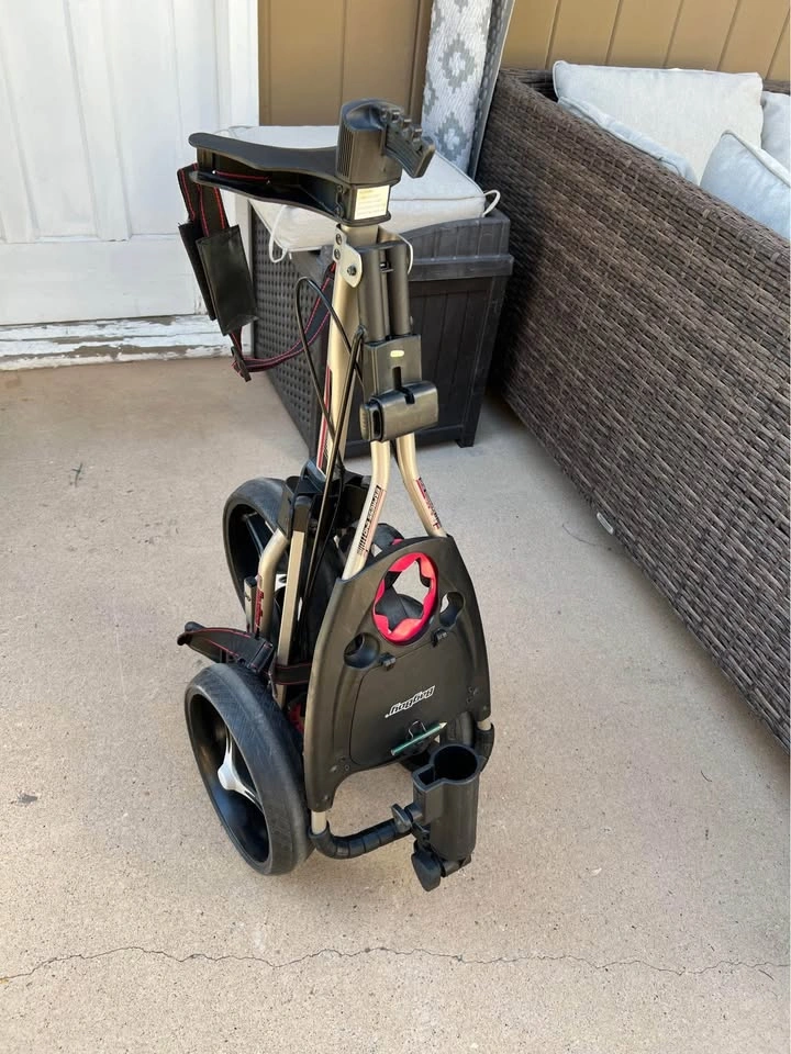 Lightweight and sturdy aluminum frame. Easy folding for compact storage. Smooth-rolling wheels for easy maneuverability. Includes drink holder, umbrella holder, and storage console. Good condition, ready for the course. Everything works, all the clips and leavers good to go.