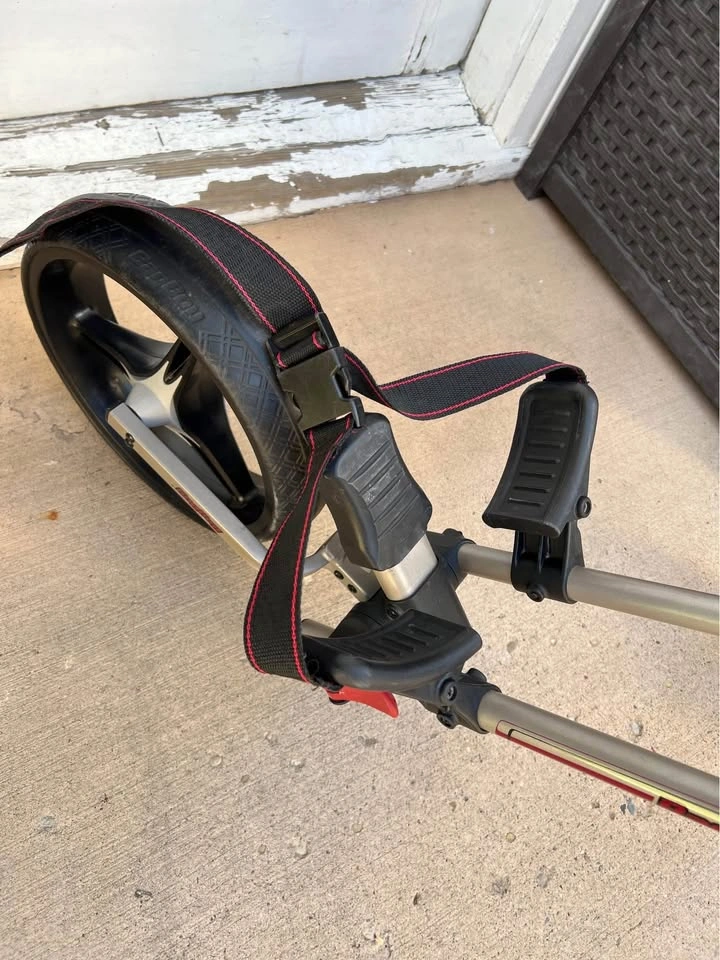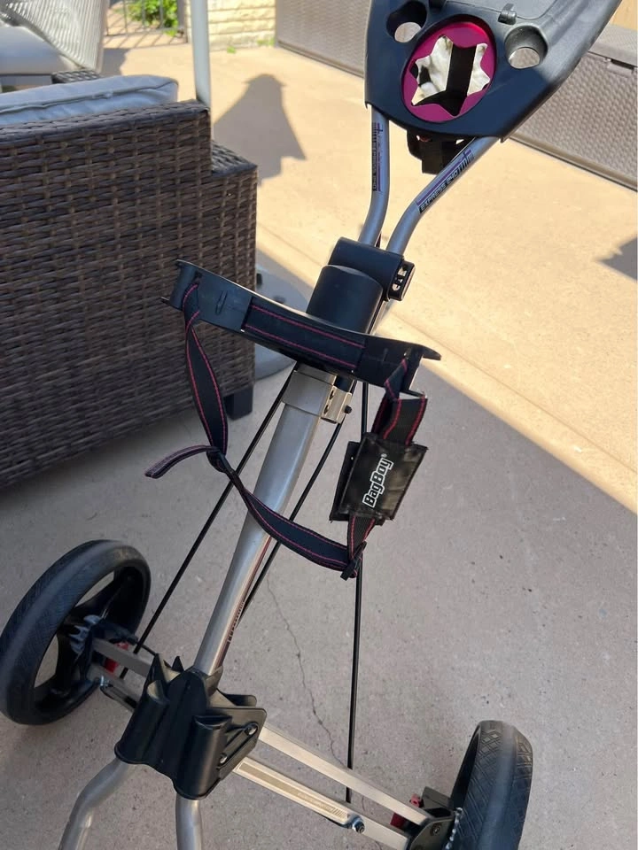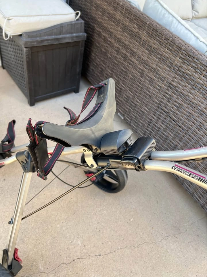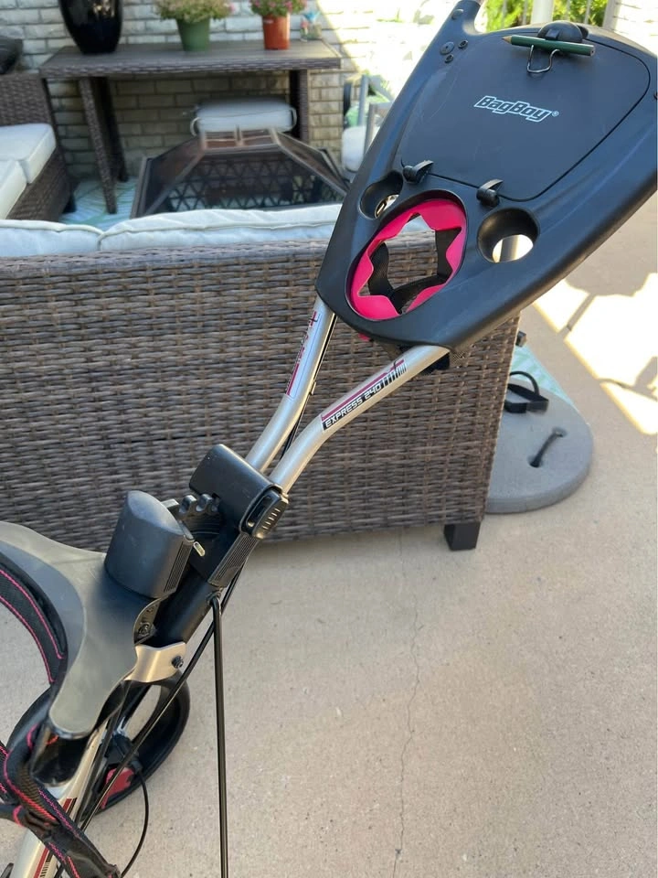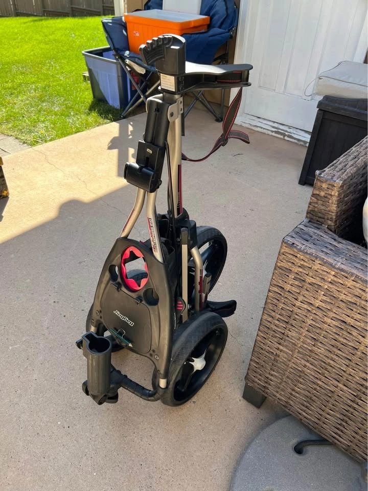 Lightweight and sturdy aluminum frame. Easy folding for compact storage. Smooth-rolling wheels for easy maneuverability. Includes drink holder, umbrella holder, and storage console. Good condition, ready for the course. Everything works, all the clips and leavers good to go.