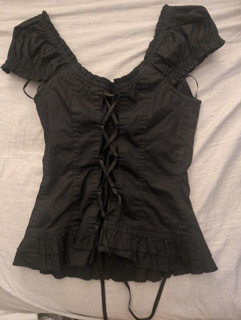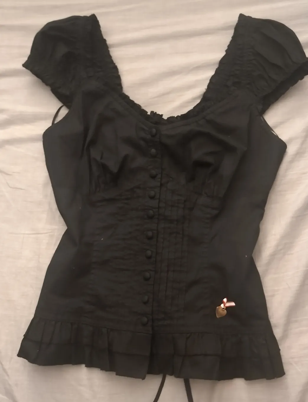 A cute black Guess blouse with a unique design! It has a button-up front and lace-up back. Perfect for adding a touch of elegance to your outfit. Size extra small