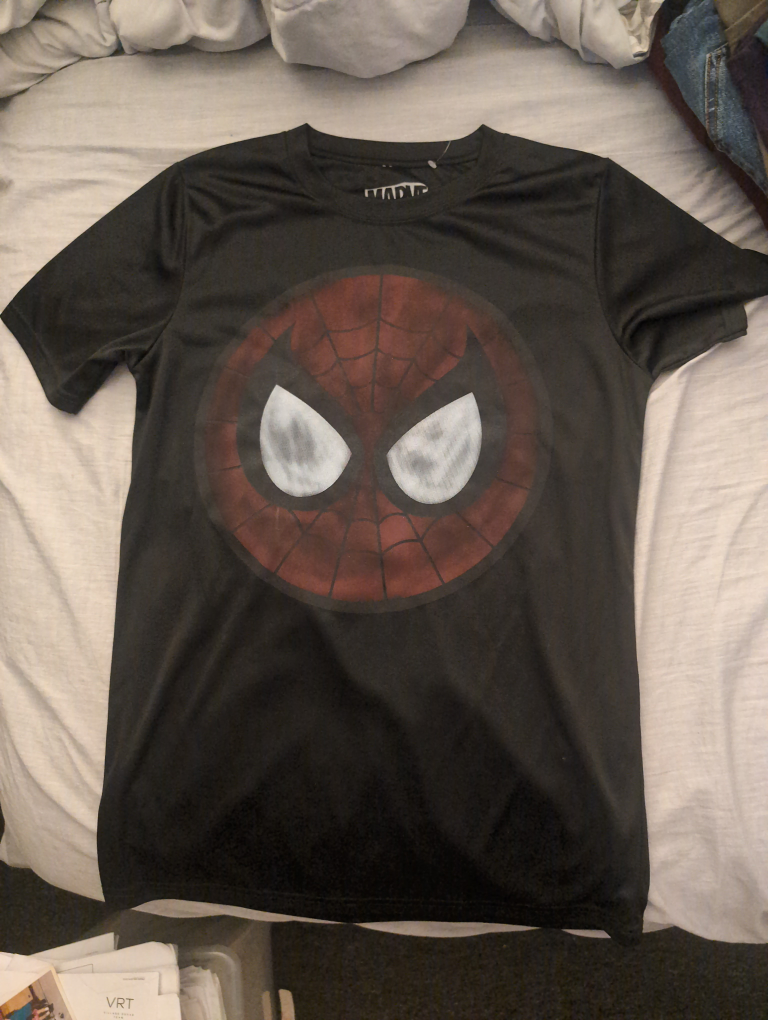 Selling a Marvel Spiderman T-shirt. It's in great condition and features the classic Spiderman mask design. Perfect for any Spiderman fan!