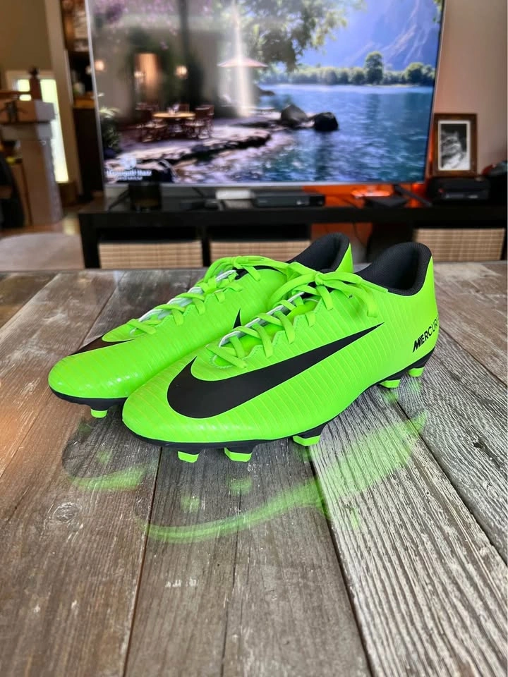 Get ready to light up the field with these Nike Mercurial soccer shoes! Designed for speed and agility, these vibrant green cleats are sure to make you stand out. Perfect for players looking to add a pop of colour to their game. Please note that these shoes are used, so they have a bit of character from previous matches. Still, they're ready for many more seasons of play!