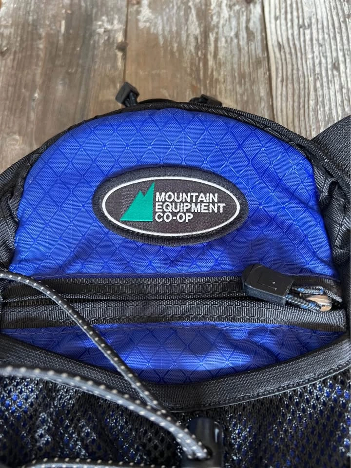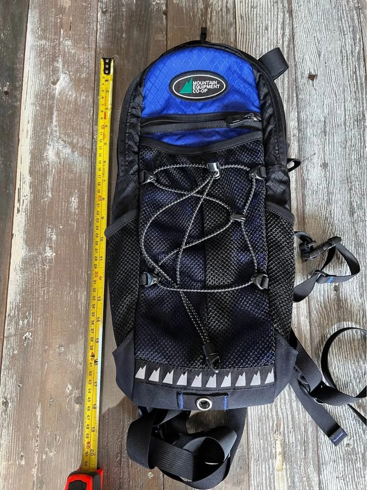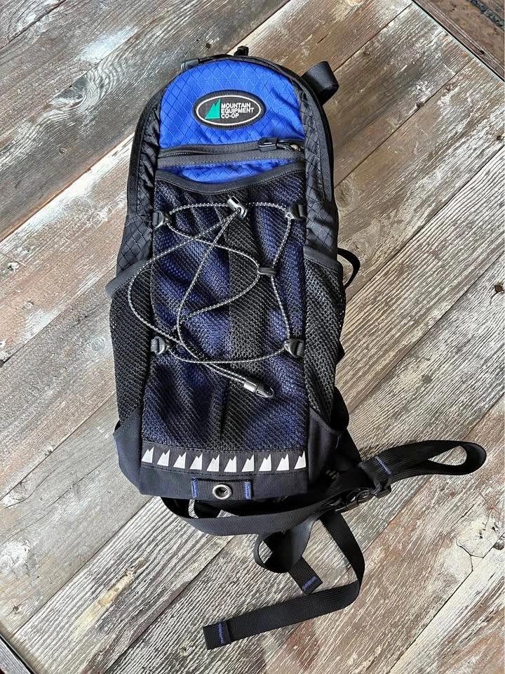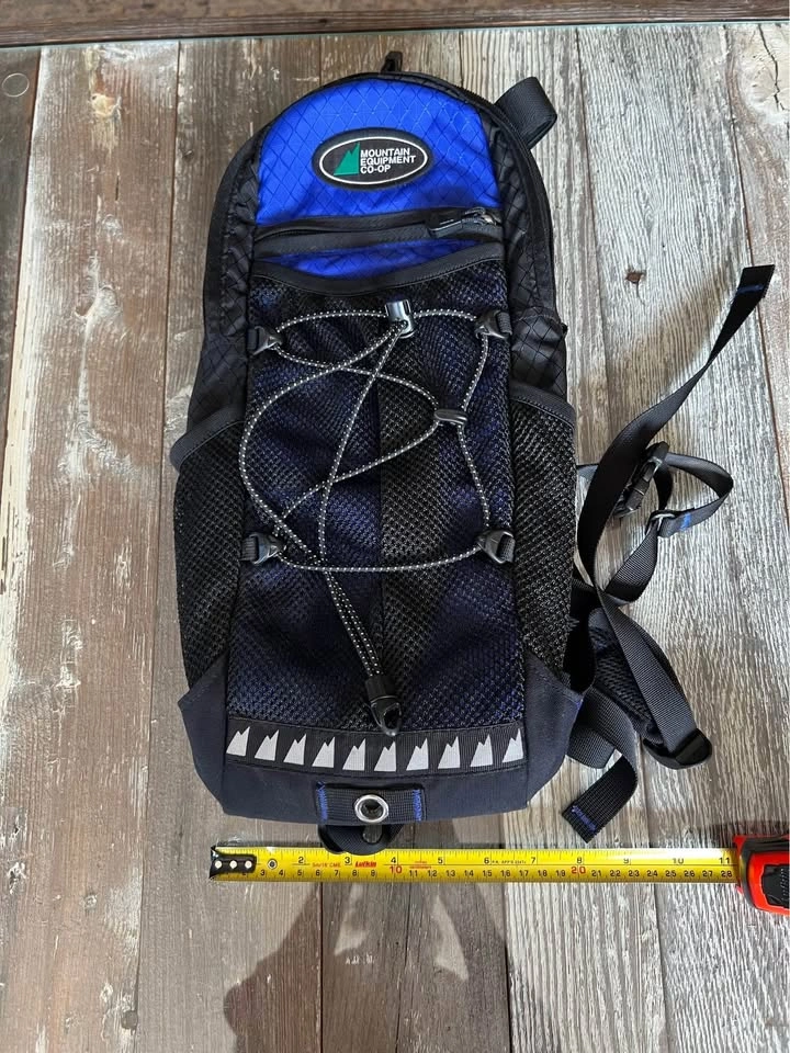 This Mountain Equipment Co-op (MEC) hydration pack is perfect for hiking and biking, with a blue and black design and multiple pockets for storage. It is designed to carry liquids, and the integrated bladder is not included. This item has been used, so expect some signs of wear. A great way to stay hydrated on your outdoor adventures! Brand: Mountain Equipment Co-op (MEC) Colour: Blue and Black Sport/Activity: Hiking, Biking. Note no bladder included.