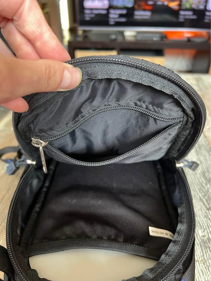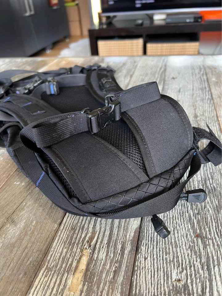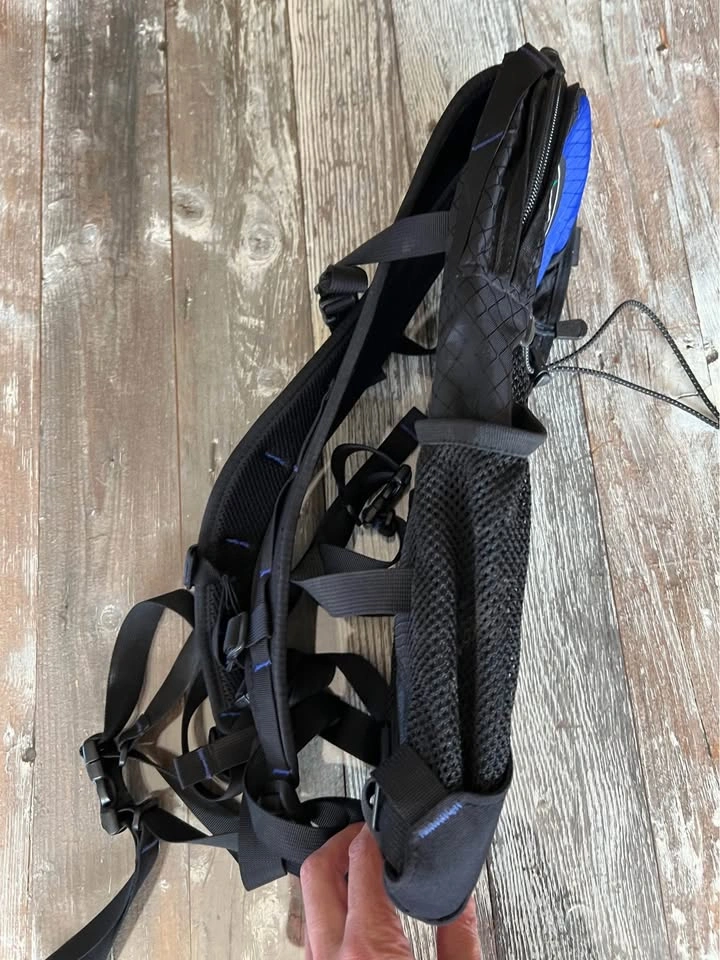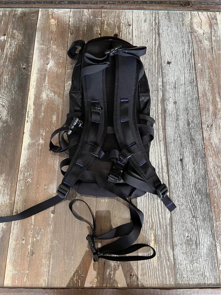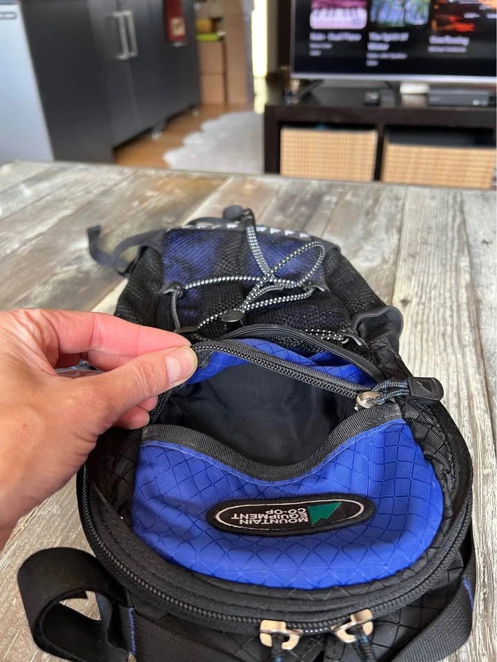 This Mountain Equipment Co-op (MEC) hydration pack is perfect for hiking and biking, with a blue and black design and multiple pockets for storage. It is designed to carry liquids, and the integrated bladder is not included. This item has been used, so expect some signs of wear. A great way to stay hydrated on your outdoor adventures! Brand: Mountain Equipment Co-op (MEC) Colour: Blue and Black Sport/Activity: Hiking, Biking. Note no bladder included.