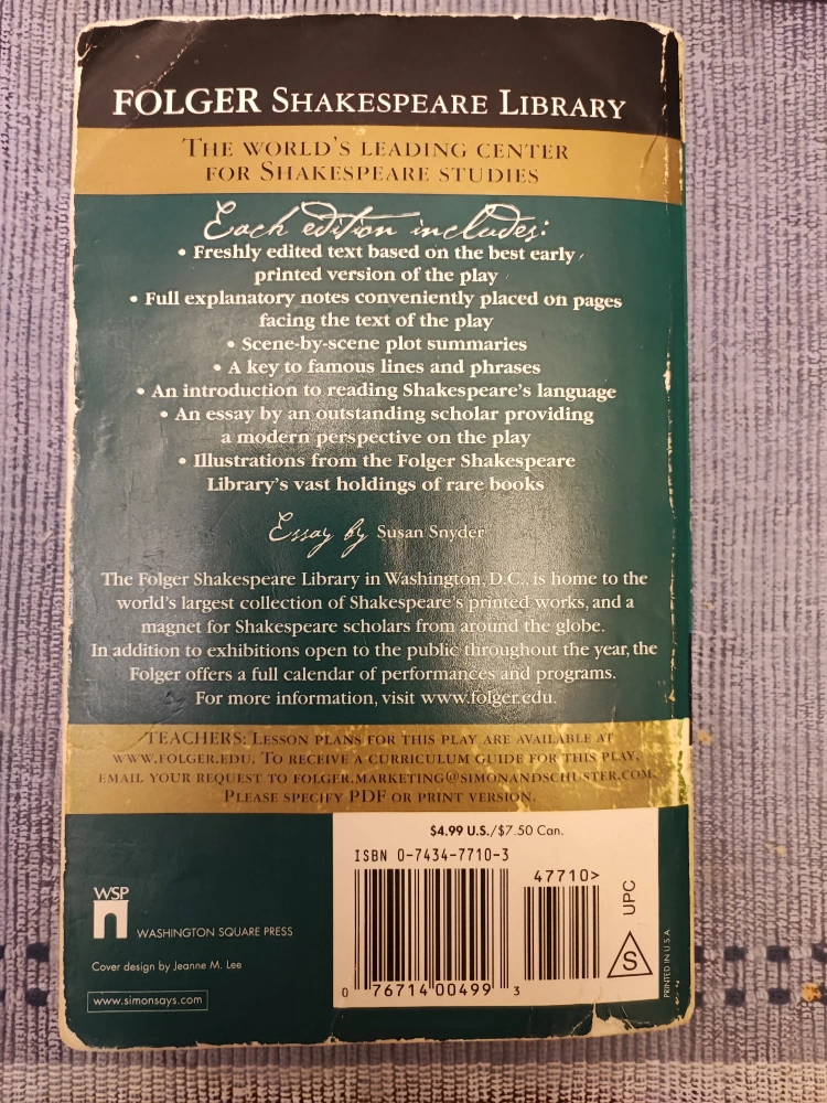 Selling a copy of Macbeth by William Shakespeare from the Folger Shakespeare Library! It includes detailed notes and essays, perfect for any student or Shakespeare enthusiast. This edition is based on the early printed version of the play and contains full explanatory notes placed on pages facing the text. It also has scene-by-scene plot summaries and a key to famous lines and phrases