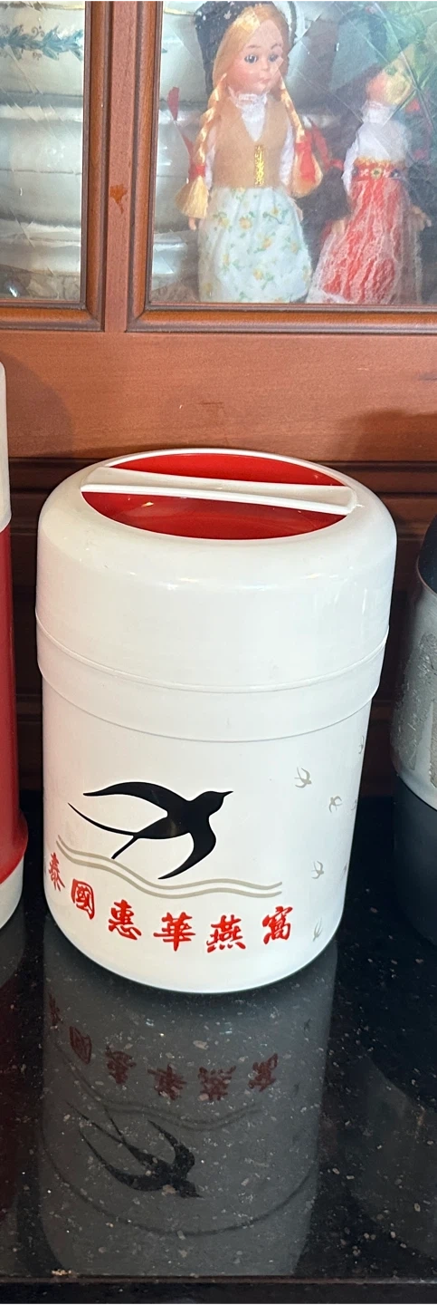This is a container with a swallow design on it! It is red and white in colour and has some Asian writing on it as well