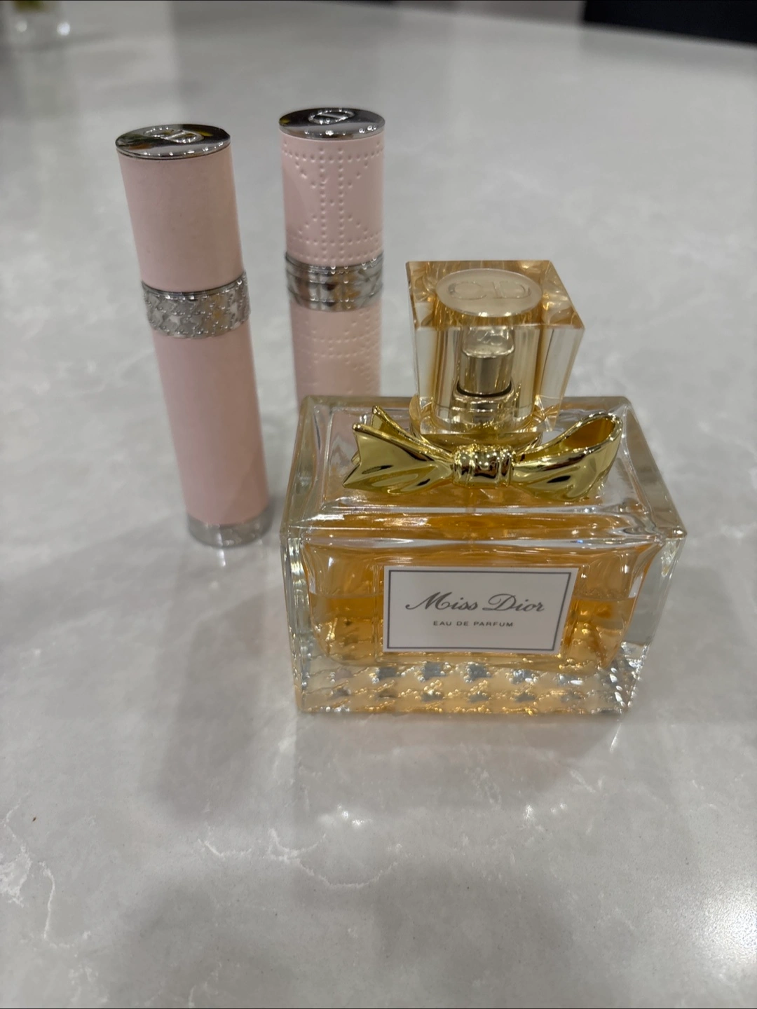 Selling a bottle of Miss Dior Eau de Parfum along with two travel spray refills. The fragrance is a classic and the travel sprays are perfect for on-the-go touch-ups! Great for everyday wear or special occasions