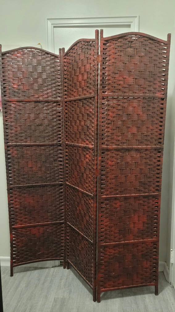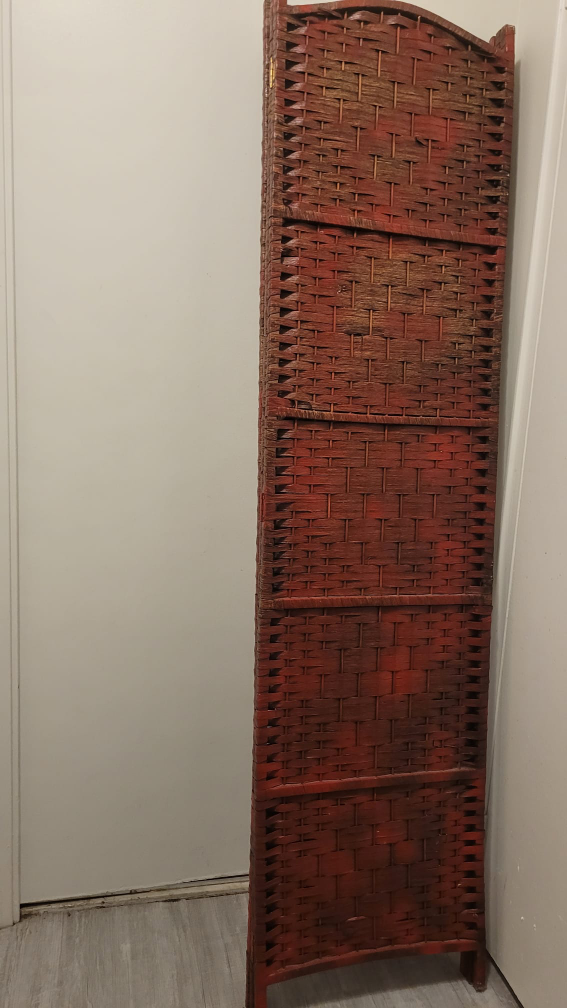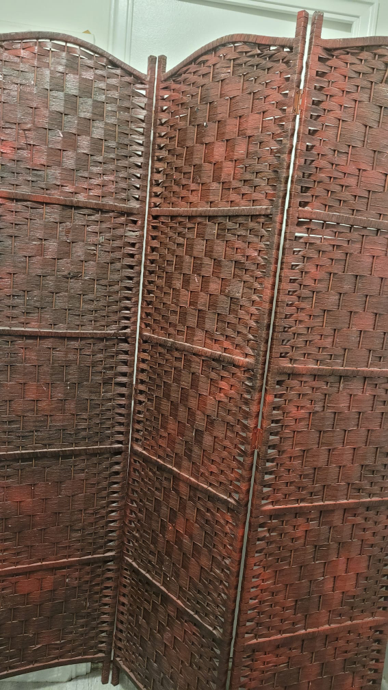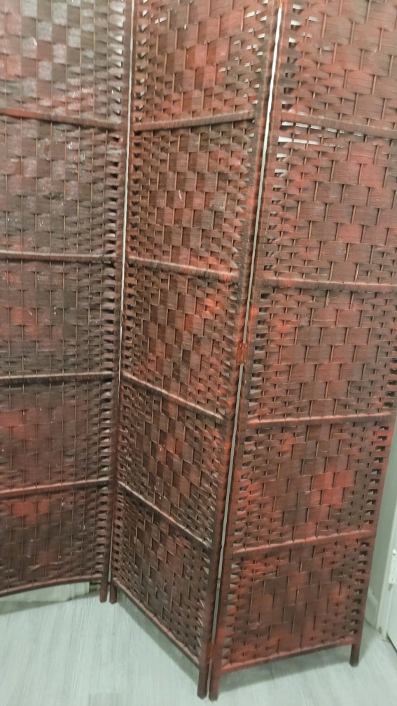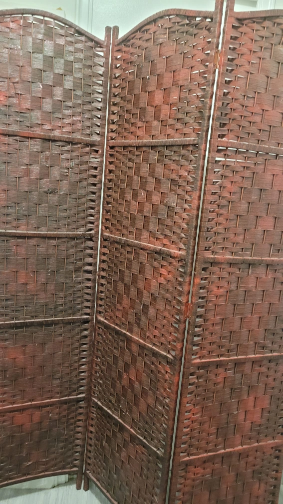 Selling a woven room divider. This screen is perfect for adding privacy or dividing a space in your home. It has a nice, rustic look with the woven design and reddish-brown finish. It's a great way to add some character to any room