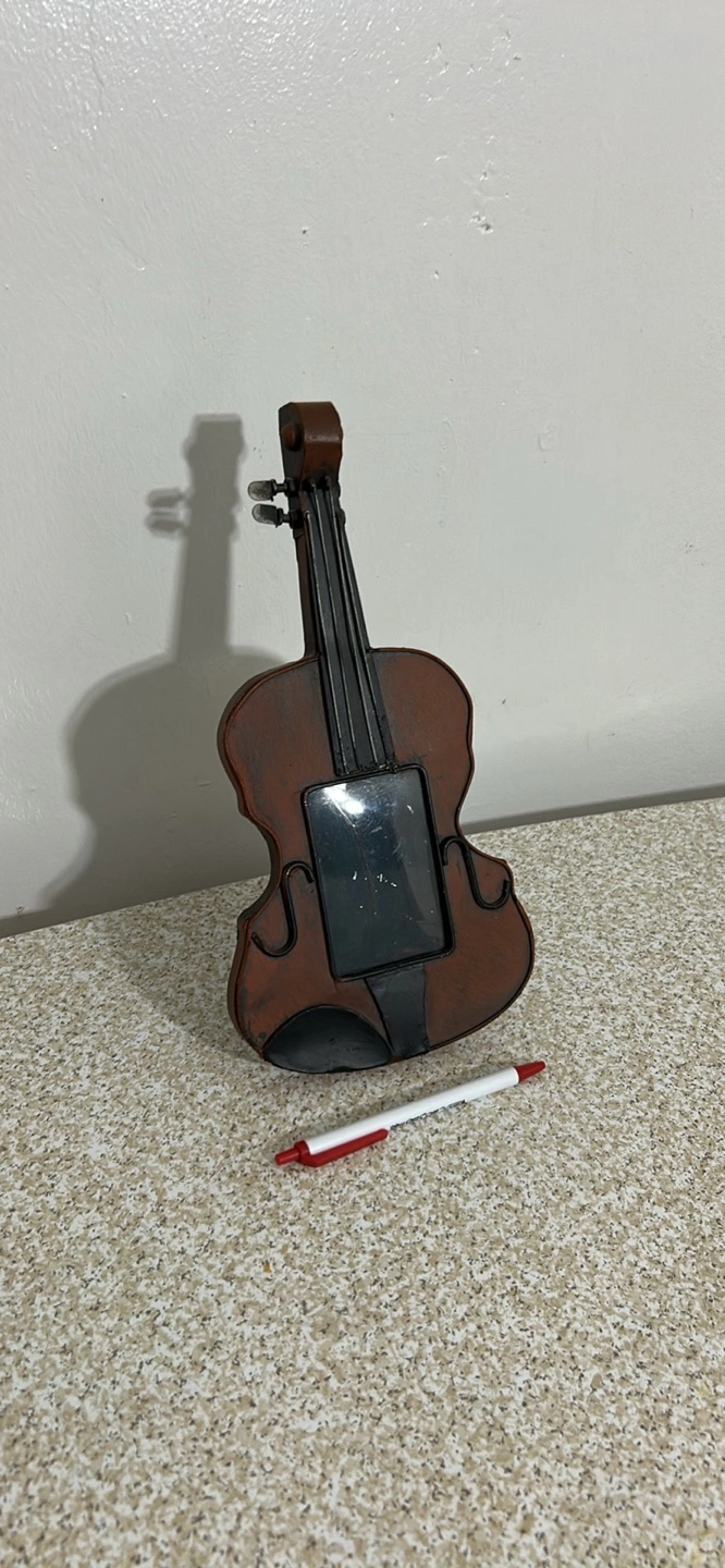 181Here's a unique violin-shaped photo frame! It's a fun way to display your favourite memories. It has a stand on the back so it can sit on a shelf or desk.