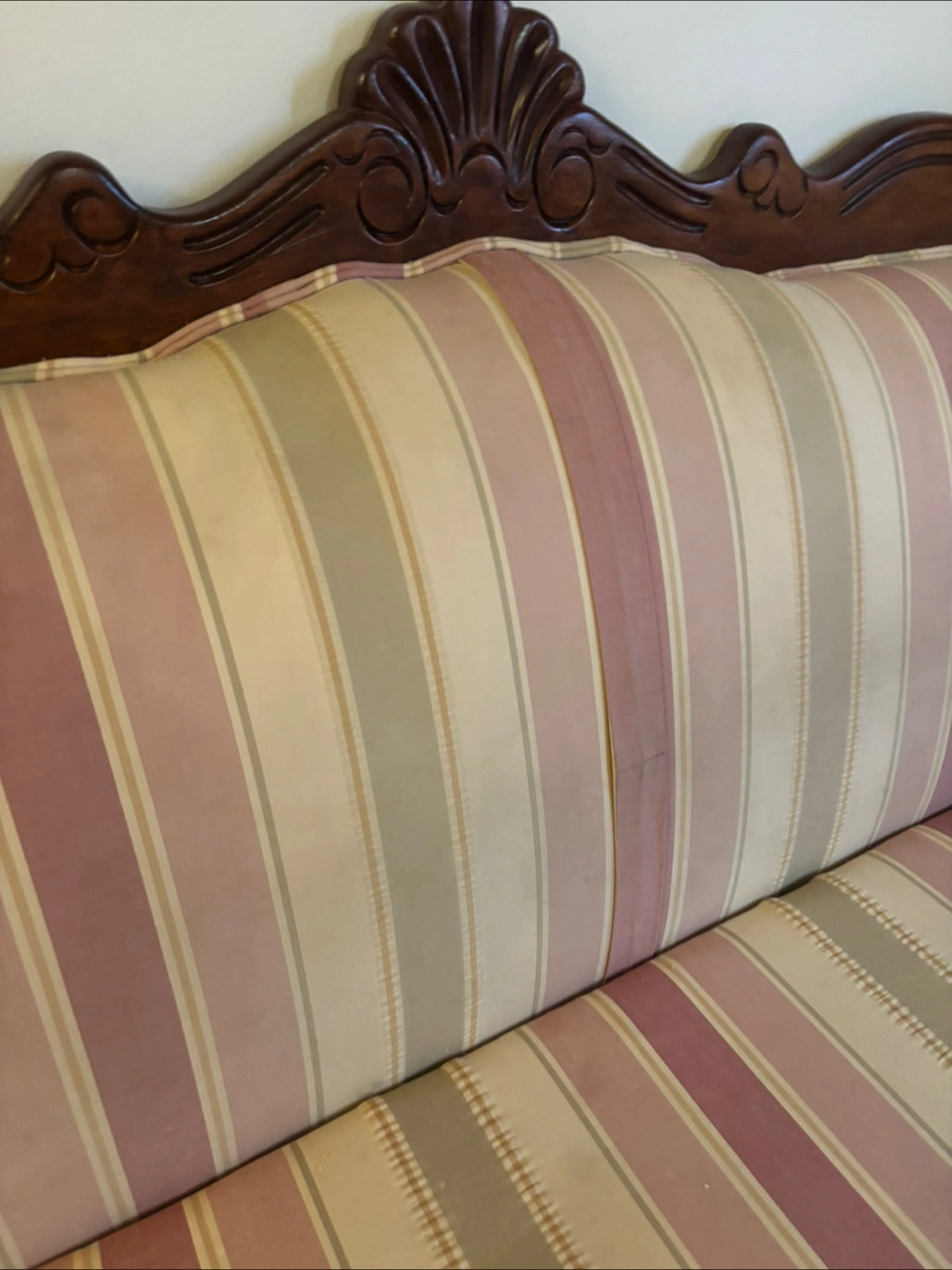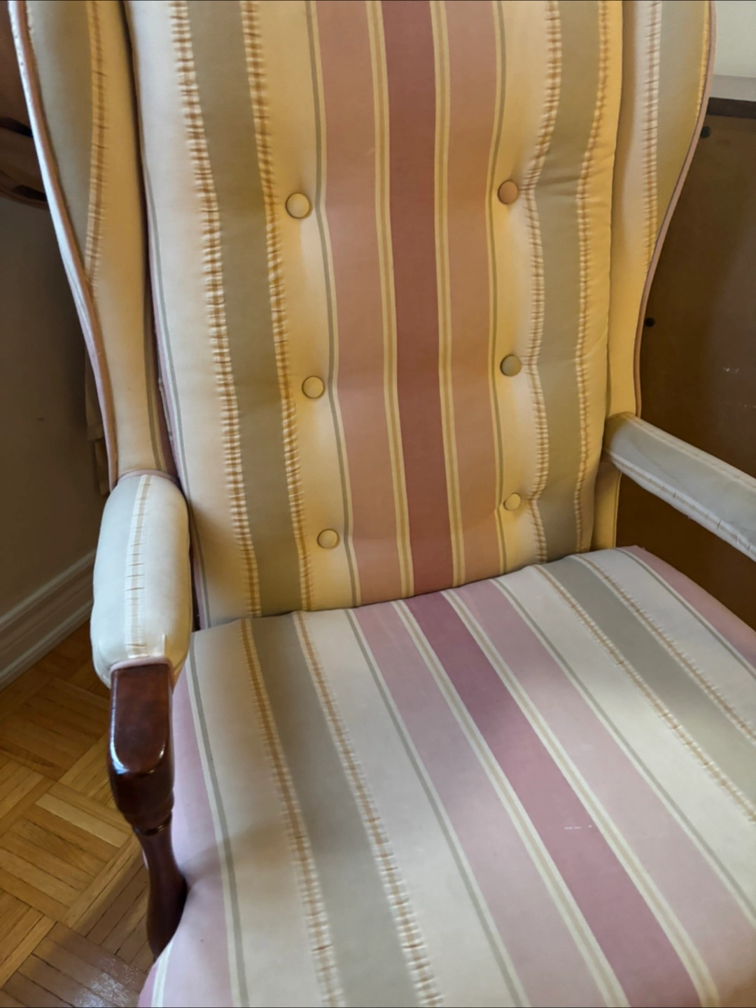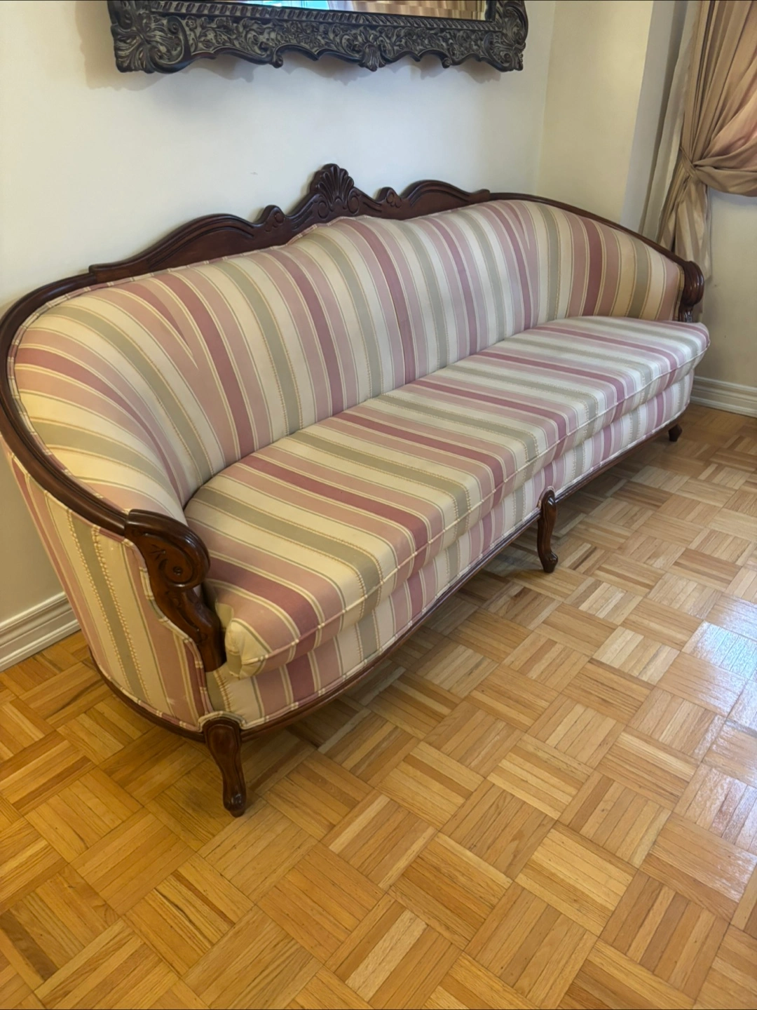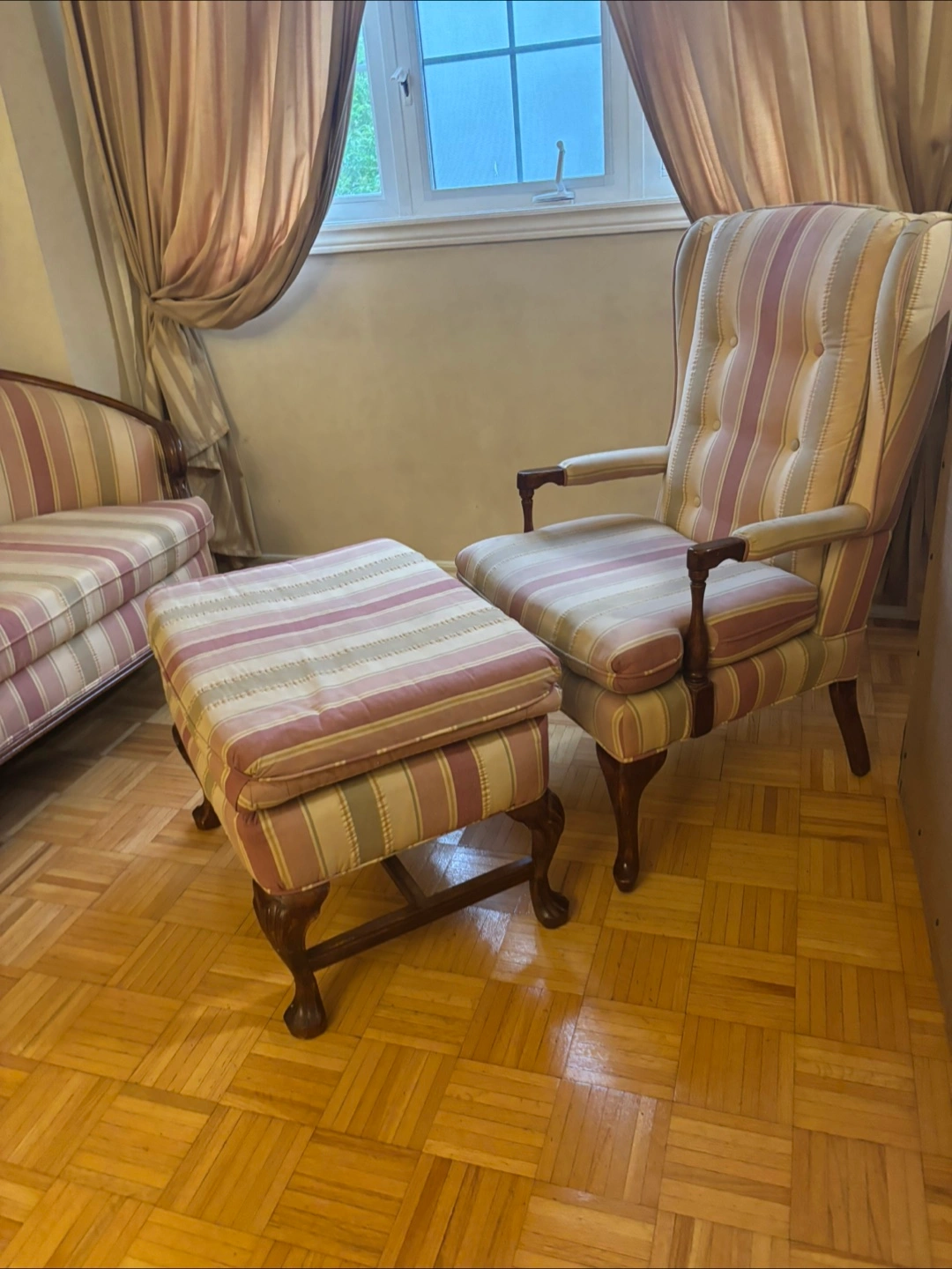 Selling a lovely armchair, ottoman, and sofa set. The set features a striped pattern with a wooden frame. Perfect for adding a touch of elegance to your living room or study